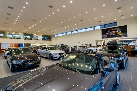 A showroom for beautiful cars should be flooded with light. The cars on display should look the same from all angles. There should be no shadows. For this reason, the new Numansdorp showroom is equipped with powerful low-glare downlights of the Glamox D70 LED family, mounted at a height of 6,5 metres.
