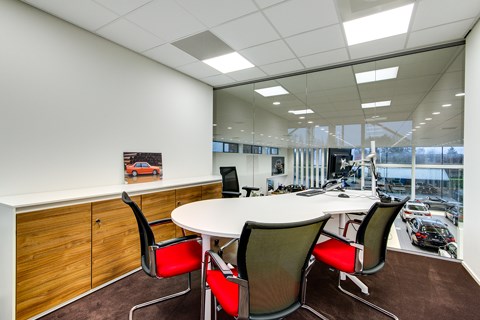 In the offices and reception area there are matching recessed luminaires of the Luxo Modul LED type, with glare-free microprismatic optics. All luminaires have a colour temperature of 4000K, which provides for a bright, daylight-related ambience that make people and cars look their best. The light levels are adjustable with the use of sensors.