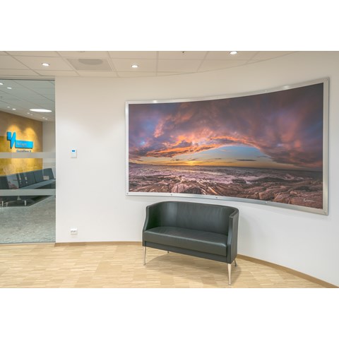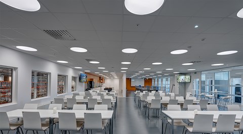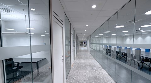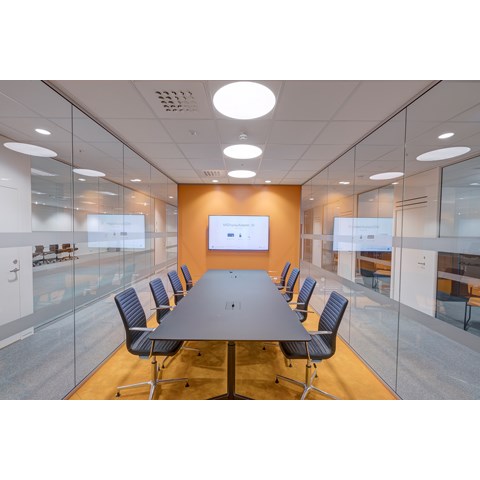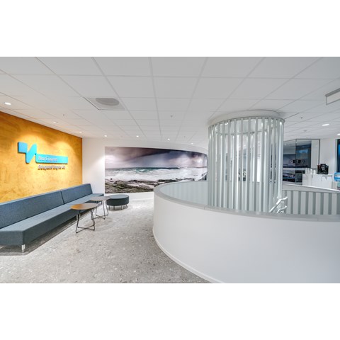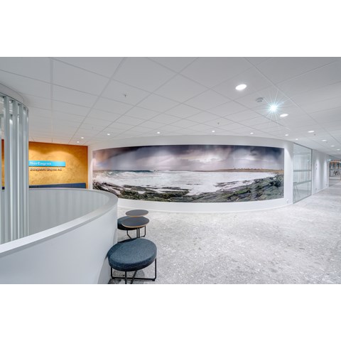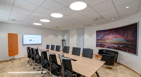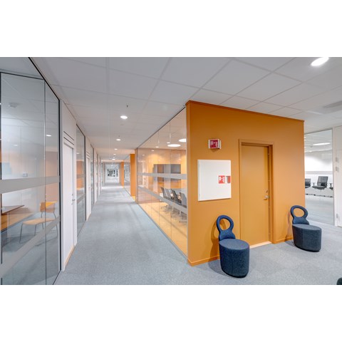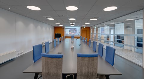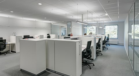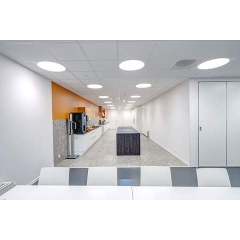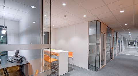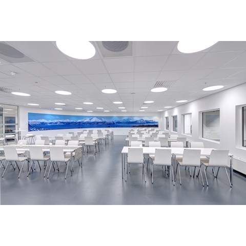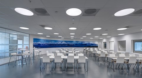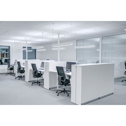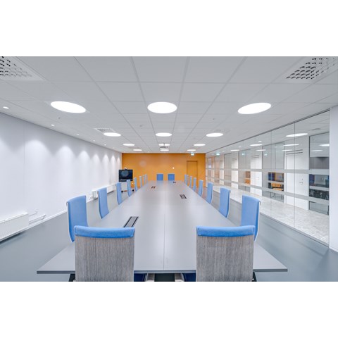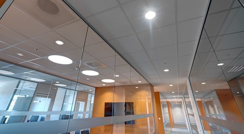 Das abgehängte Reed 1200 mit DALI wurde über den Arbeitsplätzen sowohl in den Grossraumbüros als auch in den Einzelbüros eingesetzt. Die Bürobereiche werden durch das Downlight D70-R155 ergänzt. Die Flure werden mit dem gleichen Downlight beleuchtet. Besprechungsräume verfügen über die Einbauleuchte C90 mit einer kreisrunden Lichtöffnung sowie ein kleineres Downlight des Typs D70-R108. Diese Art von Downlight wird auch zusammen mit der D70-R155 im Eingangsbereich eingesetzt. Der Ausstellungsraum wird mit C20-R625 LED mit Raster beleuchtet.