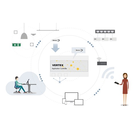 The E2D system is based on Vertex, a DALI-2 application controller developed by the Glamox Group. The Vertex Application Controller (ApC) is the brain of the E2D system and allows you to commission and monitor the light management system from one single point.