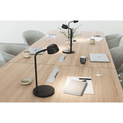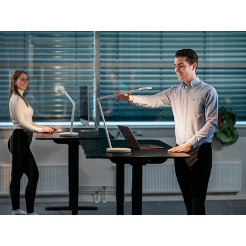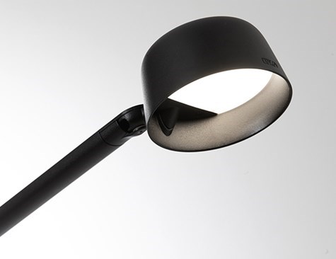 The lamp head is flat, with asymmetric light output. This means that the light is directed forward from the lamp onto the desk space in front of you. This gives a comfortable work space without reflections.