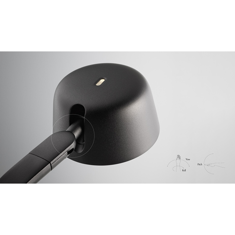 The Motus luminaires have a joint between the lamp head and arm that allows for maximum freedom of movement. This was inspired by the movements of an aircraft: An aircraft has three dimensions of movement, known as pitch, roll and yaw.