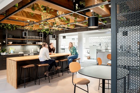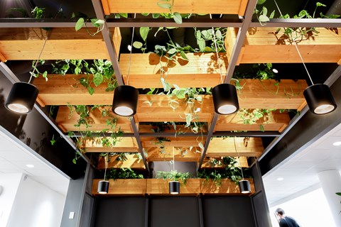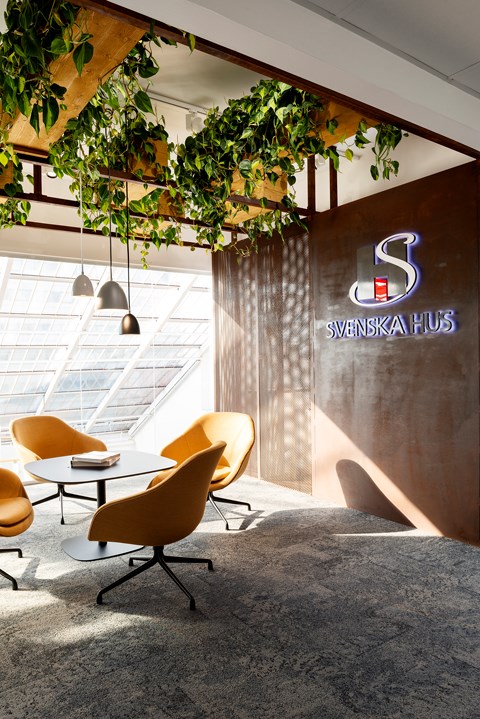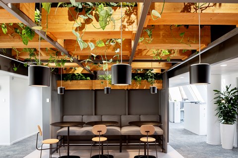 ”Vi flyttade in i K6 delvis för att komma närmare projektet men framförallt för att skapa en miljö där vi kan visa upp möjligheterna med lokalerna och fastigheten”, berättar han. ”Vid ombyggnationen av den lokal som nu är vårt regionkontor tog vi ett helhetsgrepp, där vi har öppnat upp rejält med nya glaspartier för att få ett större ljusinsläpp och byggt ett modernt kontorslandskap med spännande inredningsdetaljer och smarta funktioner. Då syftet med vårt nya kontor också är att vara ett showroom för hela fastigheten ville vi göra något annorlunda för att skapa en extra effekt, vilket resulterade i mycket grönska som exempelvis växtinstallationer i taket vid entré och fikarum. Tillsammans med en genomtänkt belysning blev resultatet mycket lyckat!”