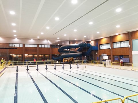 A £2.7 million refurbishment program was undertaken to replace back of house systems, including the installation of a new ceiling and energy efficient lighting, as the  original installation dated back to the 1980s. Our brief was for an energy efficient LED solution that could be installed into a high ceiling with recessing frame assembly, maintained from above the ceiling void, and subjected to high ambient temperature and resistant to chorine vapour. Of course, the quality of light from the new system should provide a more comfortable and inviting pool environment for customers.