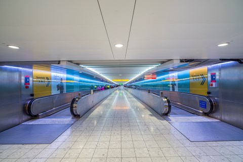 The passenger subway linking the terminals at Heathrow were lit by a combination of linear fluorescent tubes and recessed and surface mounted CFL downlights. Subway transfers were not a particularly pleasant experience for passengers. It was important that we should be able to enhance the lighting in these areas.