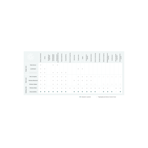 Du får et næsten uendeligt udvalg af løsninger på grund af det brede udvalg af DALI-2-armaturer, sensorer, kontakter og sikkerhedsbelysningsprodukter - alt sammen beregnet til at opfylde behovene i enhver type projektstørrelse i en eller flere bygninger.
