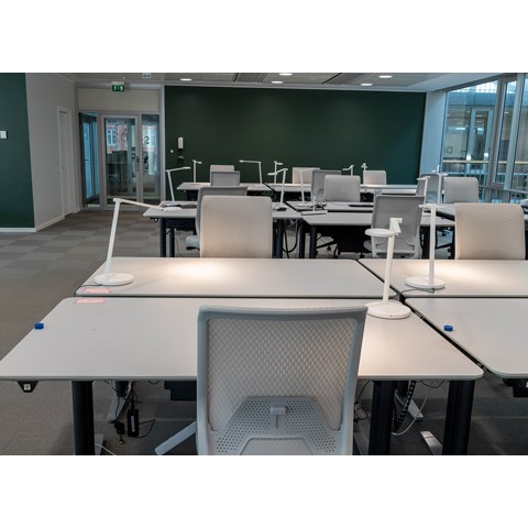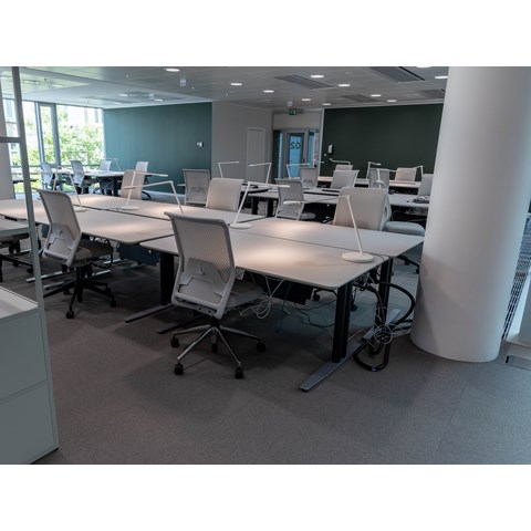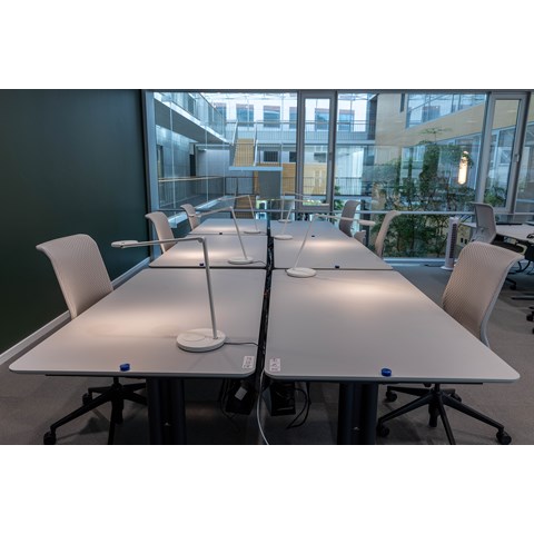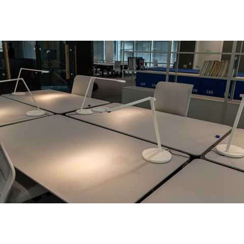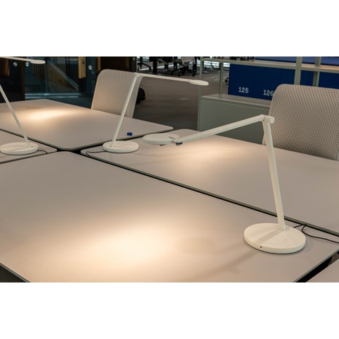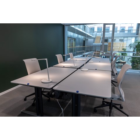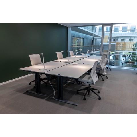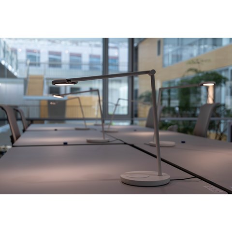 Vi har i alt leveret 664 stk. Motus Flat i hvid med induktiv bordfod (trådløs opladning) til de to kontorer.