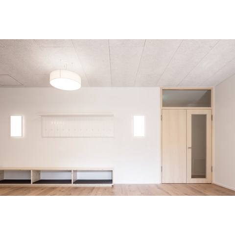 Die Materialien der Leuchten und die warme Lichtfarbe ergänzen die Innenraumgestaltung des Neubaus. Dadurch entsteht eine wohnliche und gemütliche Atmosphäre. In den Korridoren sind grossflächige, rechteckige Wandleuchten mit Indirektlicht angebracht. Bei den Garderoben im Eingangsbereich sowie in den Aufenthaltsräumen wurden runde Stoffleuchten gependelt.