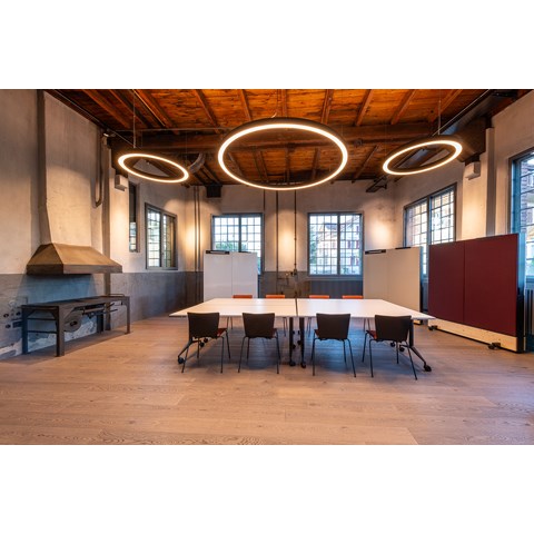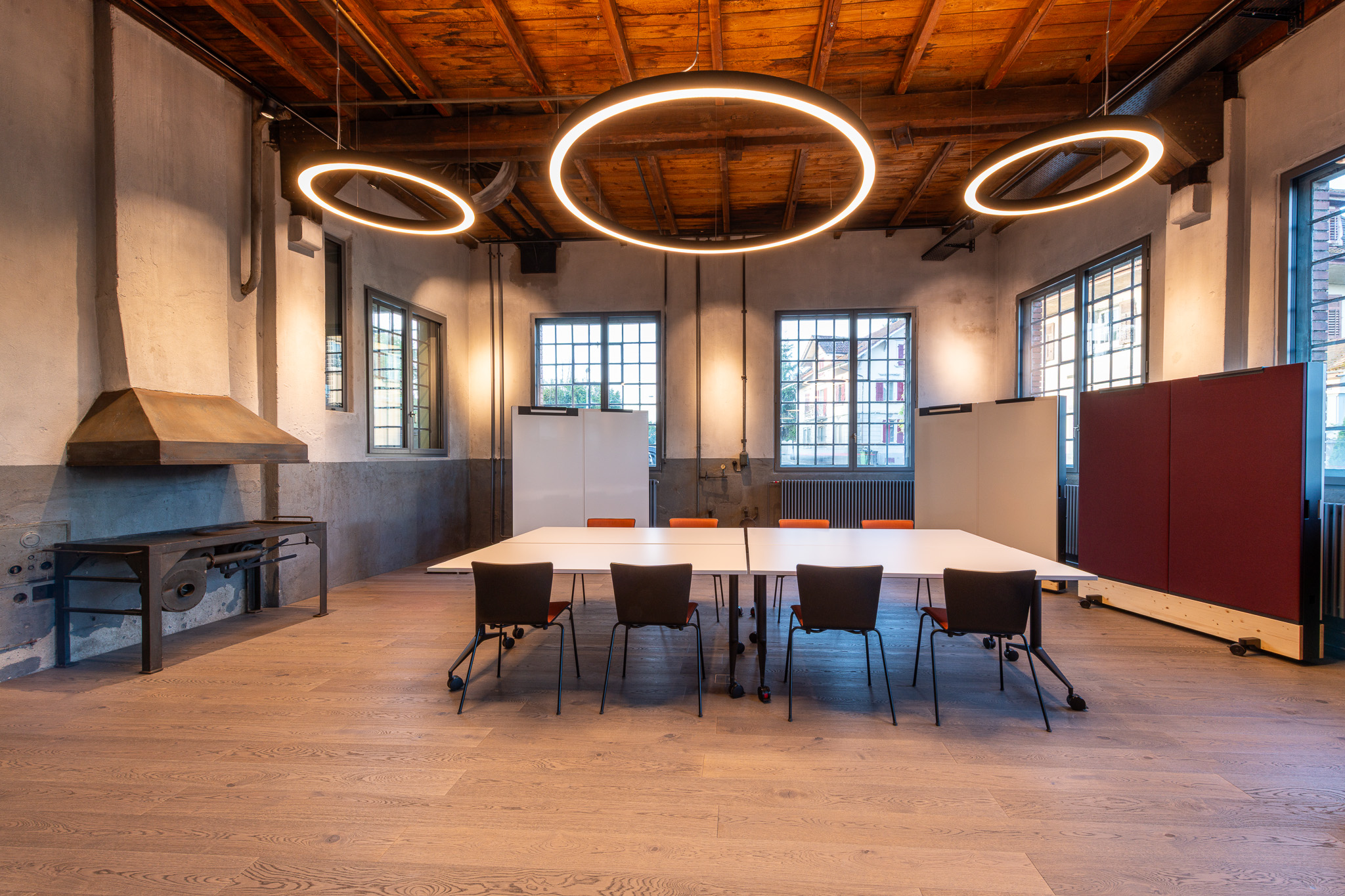 In dem separaten Meetingraum, der nur durch eine grosse Glasfront vom restlichen Raum getrennt ist, steht noch eine alte Esse, in der früher das Schmiedegut erhitzt wurde. Dieses historische Element macht den Raum besonders und schafft in Kombination mit der modernen Möblierung und den eleganten Ringleuchten FX65-P eine perfekte Symbiose von Vergangenheit und Gegenwart.