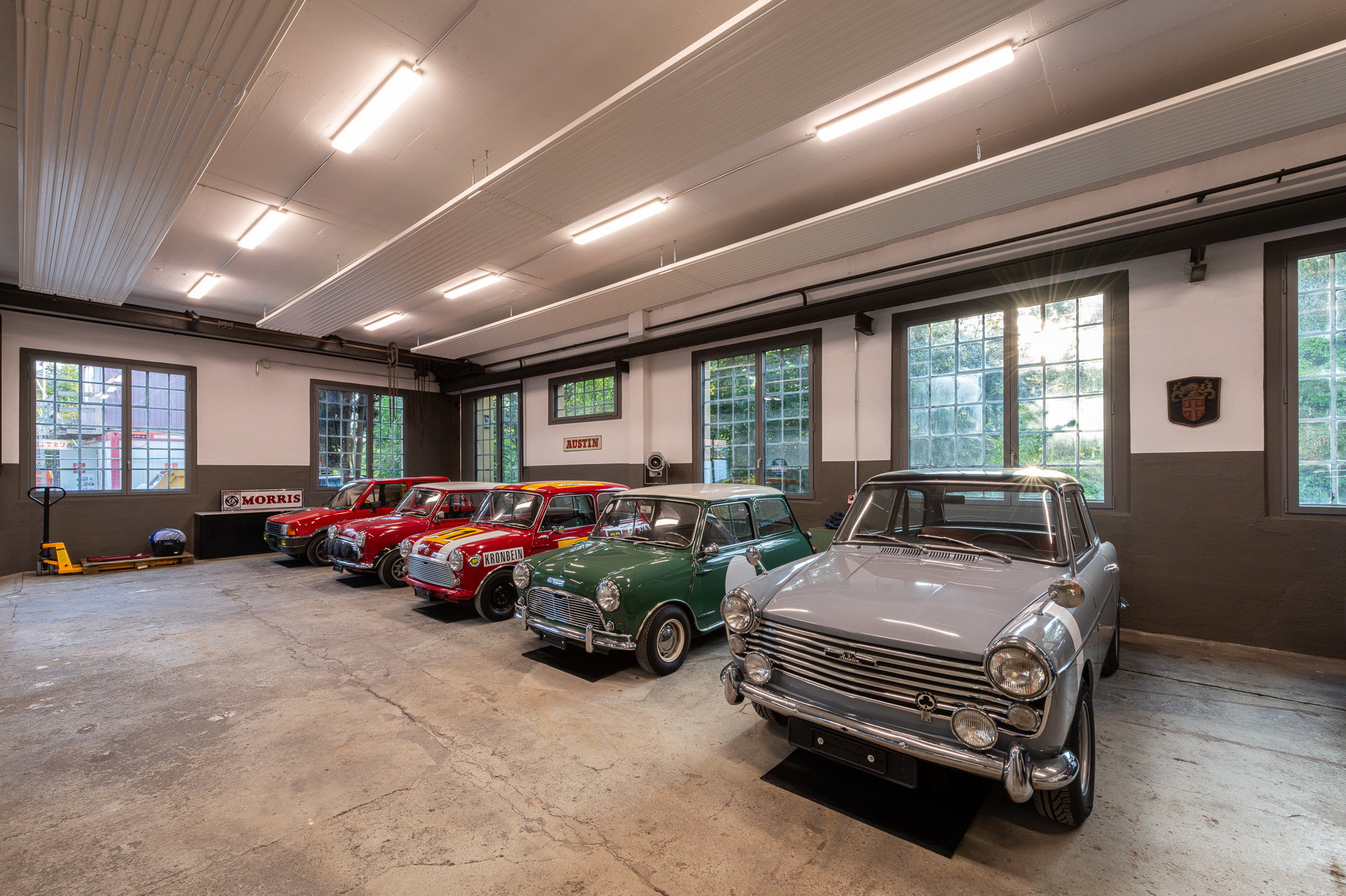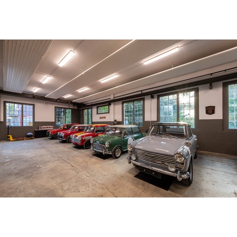 Zu guter Letzt wurde ein Teil des Gebäudes in eine Oldtimergarage umgewandelt – passender hätte es nicht sein können. Die alten Karossen stehen glänzend aufgereiht und warten darauf, bewegt zu werden. Die schlichte Grundbeleuchtung mit der LINE-S tritt nicht zu stark in den Vordergrund und fügt sich harmonisch in den Raum ein.