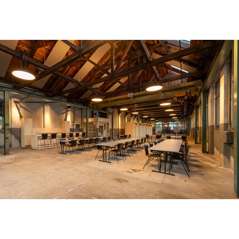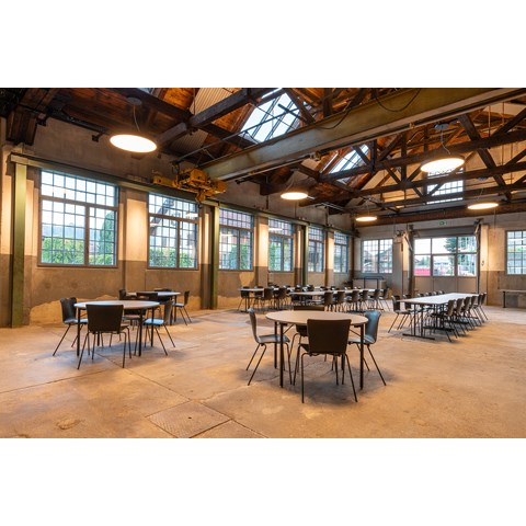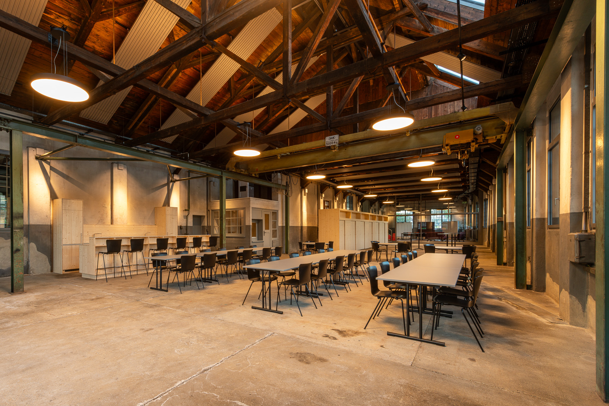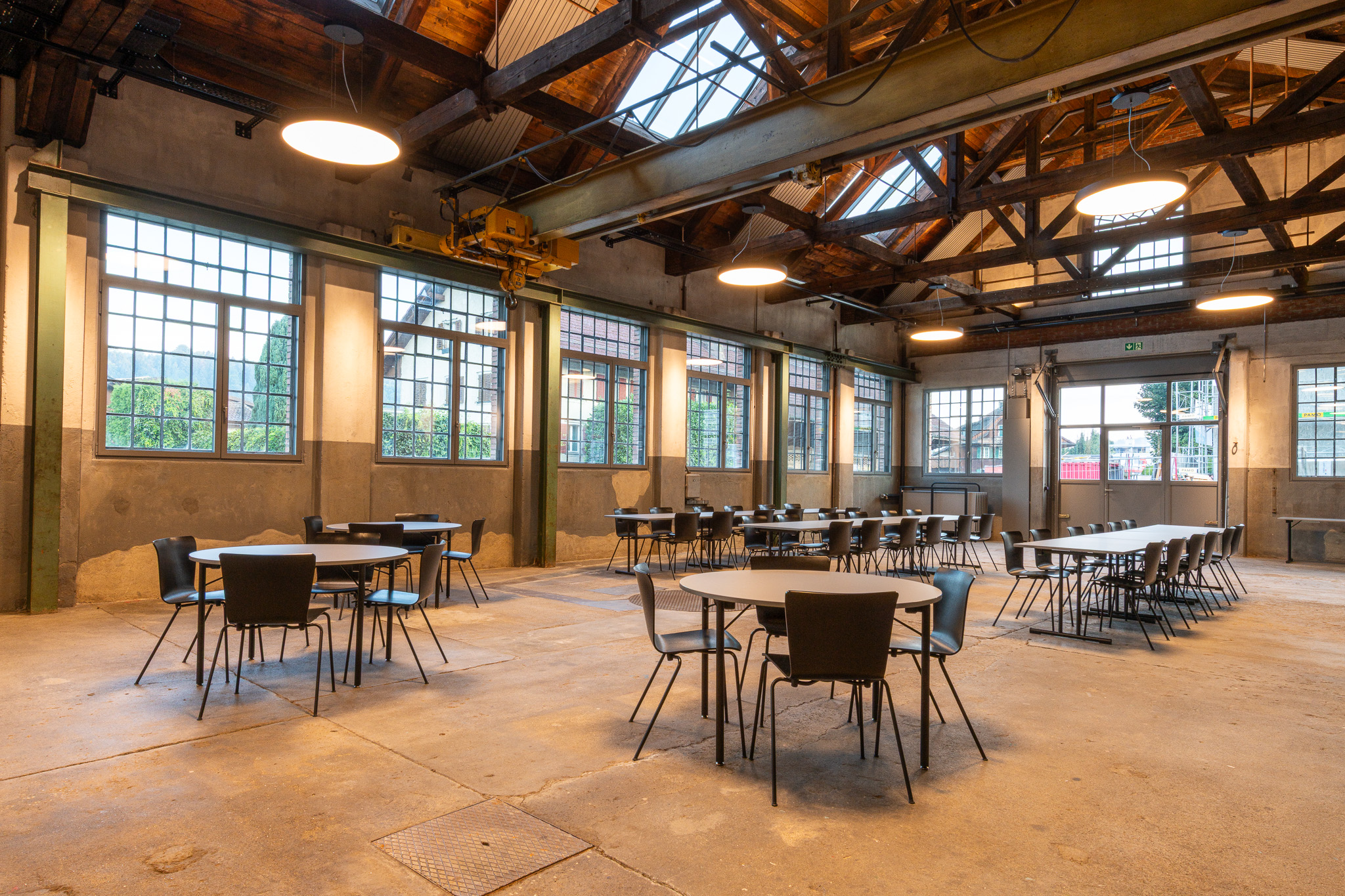 Die Halle wurde komplett geöffnet und zeigt nun ihre volle Grösse. Es ist ein Raum entstanden, der Platz für unterschiedlichste Veranstaltungen bietet. Auch die Beleuchtung ist in diesem Gebäudeteil zu einem echten Hingucker geworden. Die grossen Pendelleuchten C90 durchbrechen mit ihrer runden Form die klaren, harten Linien der Architektur und setzen stilvolle Akzente. Zudem wurde die alte Dachkonstruktion ausgeleuchtet, was dem Raum zusätzliche Tiefe und Grosszügigkeit verleiht. Zu guter Letzt sind die tragenden Säulen mit S90-Strahlern beleuchtet, welche das Lichtkonzept perfekt ergänzen und dem Raum eine besondere Atmosphäre verleihen.