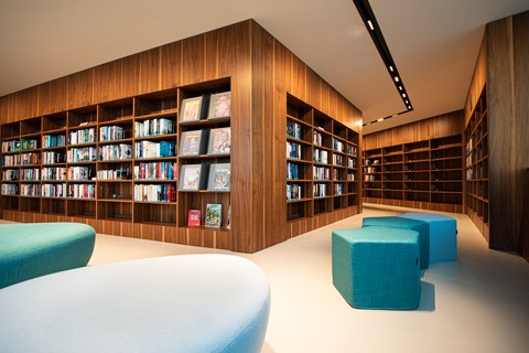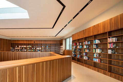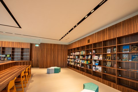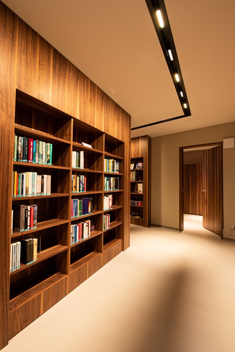 Ein warmes Raumgefühl wird durch den Einsatz von viel Holz sichergestellt. In der Bibliothek wurde der Sondereinbau Kanal 2LOOK4 50 PLUG mit einer schmalen Öffnung für die Leuchteneinsätze von nur 50 mm verwendet und ist wie das Gebäude in einem Fünfeck angeordnet.