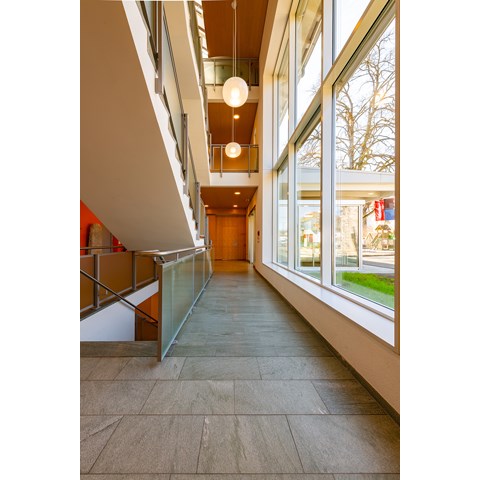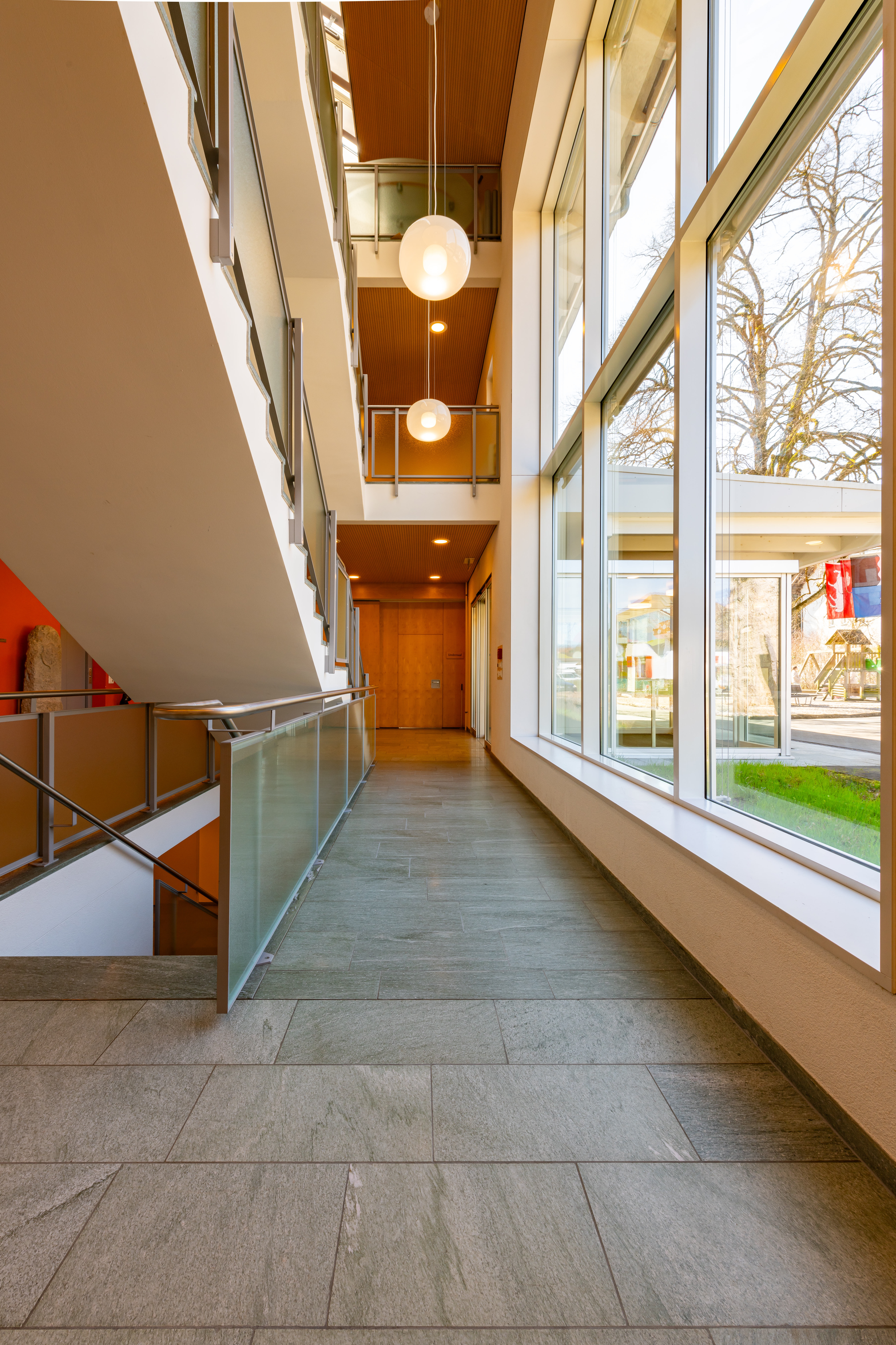 Im Eingangsbereich waren bereits Einbauleuchten mit relativ grossen Ausschnitten installiert. Diese wurden durch D70-R Downlights von Glamox ersetzt. Da die neuen Leuchten die vorhandenen Öffnungen nicht vollständig abdeckten, kamen standardisierte Ausgleichsringe in Leuchtenfarbe zum Einsatz, welche die verbleibenden Bereiche sauber abdeckten. Zusätzlich wurden beim Treppenaufgang dekorative Pendelleuchten der Serie SNÖ verwendet, welche diesen Bereich sanft und stimmungsvoll ausleuchten.