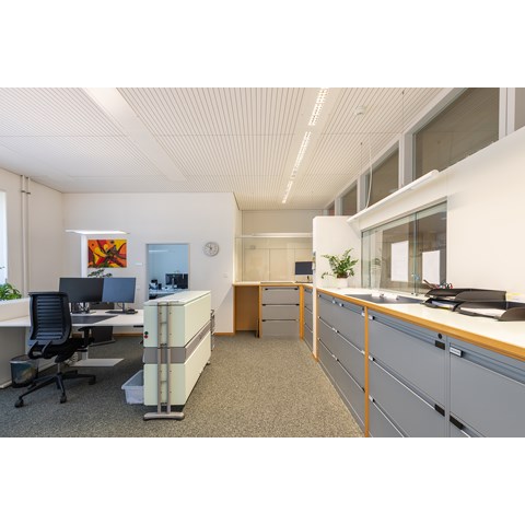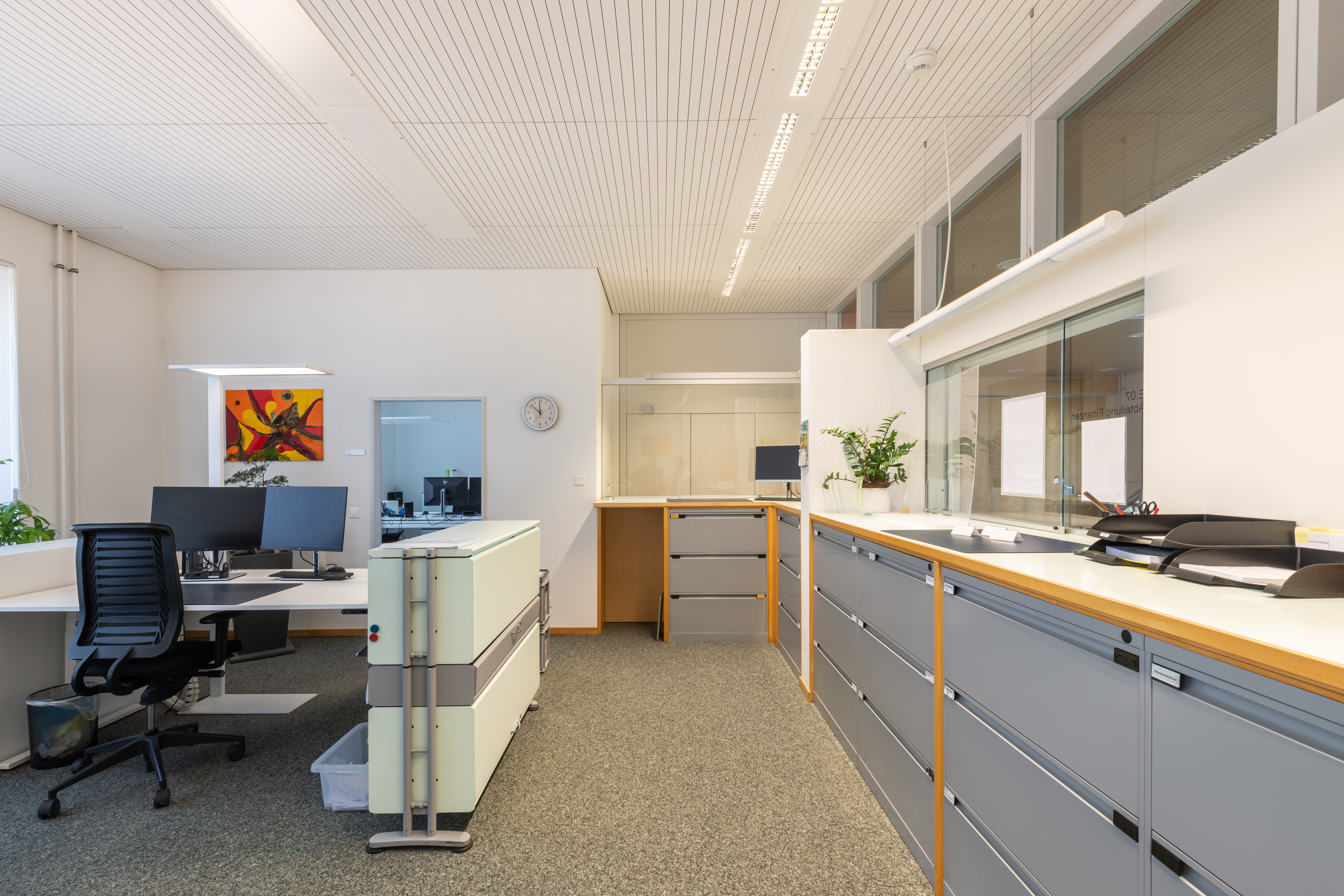 Auch die Büroräume wurden unter ähnlichen Voraussetzungen saniert. Im Durchgangsbereich wurde eine lineare Einbauleuchte vom Typ CREP-R in Sondergrösse eingesetzt, die speziell auf die vorhandenen Gegebenheiten angepasst wurde. So konnte auf bauliche Veränderungen an der Decke verzichtet werden. An den Arbeitsplätzen blieben die bestehenden Stehleuchten erhalten, wodurch zusätzliche Deckenleuchten überflüssig waren. Dennoch wurde auch hier eine optische Einheit erzielt: Mit einer Sonderversion des Rahmens und der Blende der CREP-R-Leuchte konnten die bestehenden Deckenausschnitte sauber abgedeckt werden.
