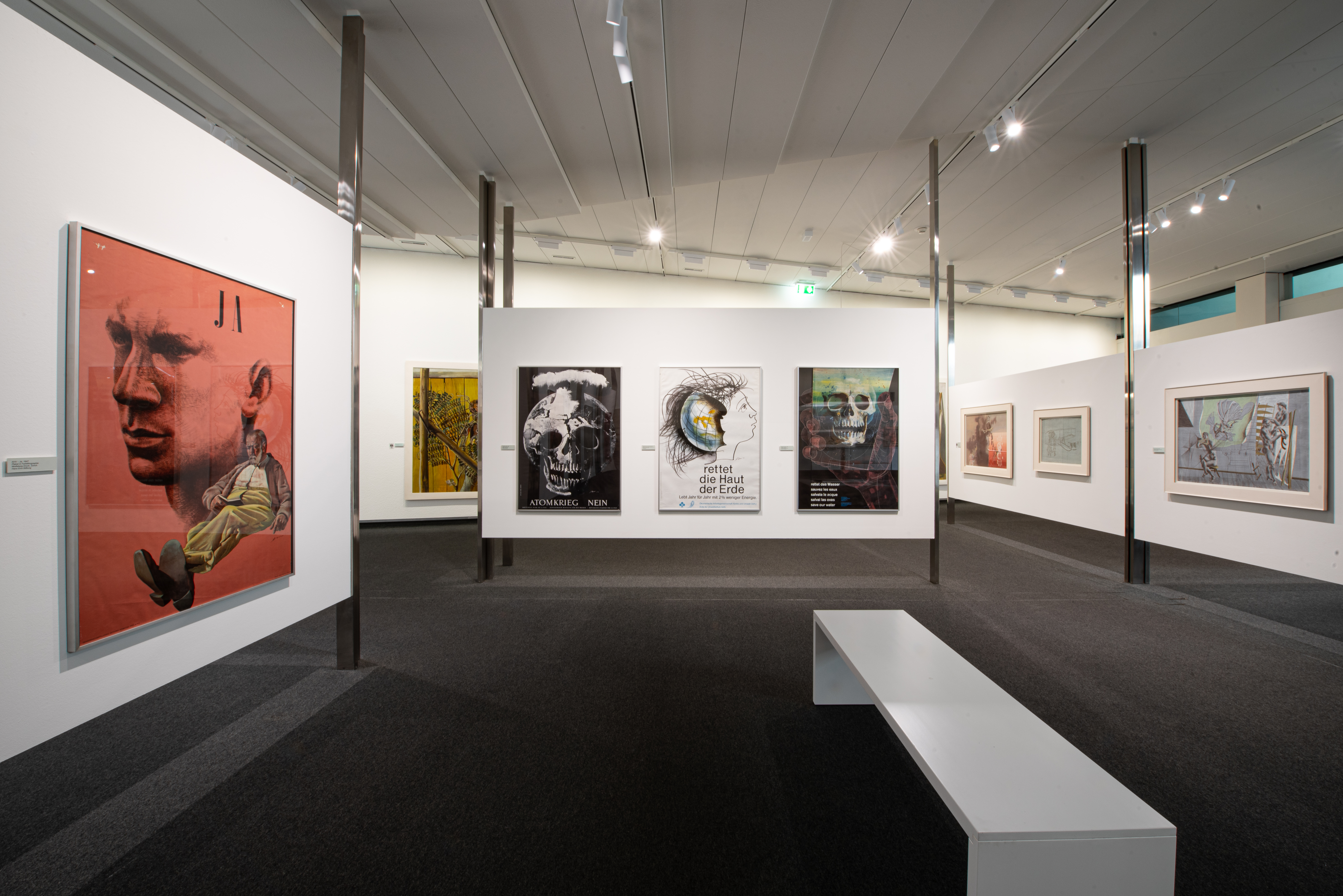Vor der Beleuchtungssanierung erhielt der hexagonale Baukörper im Inneren einen weissen Anstrich, wodurch er hell und einladend wirkt. Durch die gleichmässige Anstrahlung der Seitenwände mit den MAGIQ PLUS WALLWASH kommen Kunstwerke jeglicher Grösse optimal zur Geltung. Die zentral platzierten Trennwände werden mit IMAGINE Strahlern beleuchtet, die flexibel auf Stromschienen angebracht sind. Durch den Einsatz linearer Streulinsen wird eine sehr gleichmässige Beleuchtung erreicht. Durch diese Form der Beleuchtung mit «weichem» Licht entstehen nahezu keine Schatten und die Kontraste werden minimiert. Durch diese Beleuchtung wird der Betrachter nicht vom Wesentlichen der Werke abgelenkt.