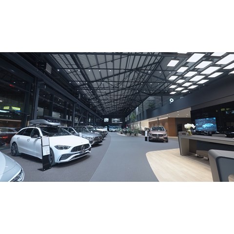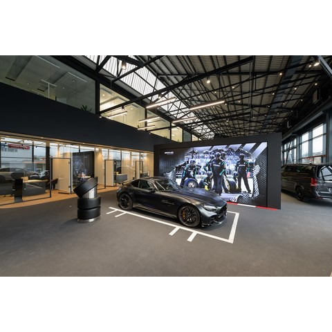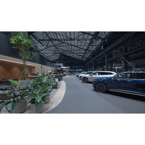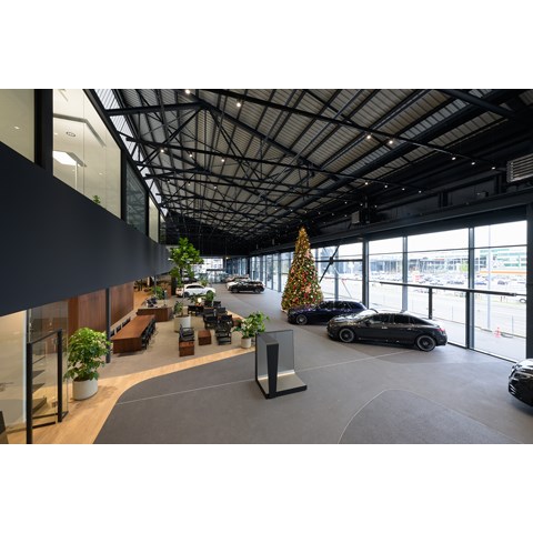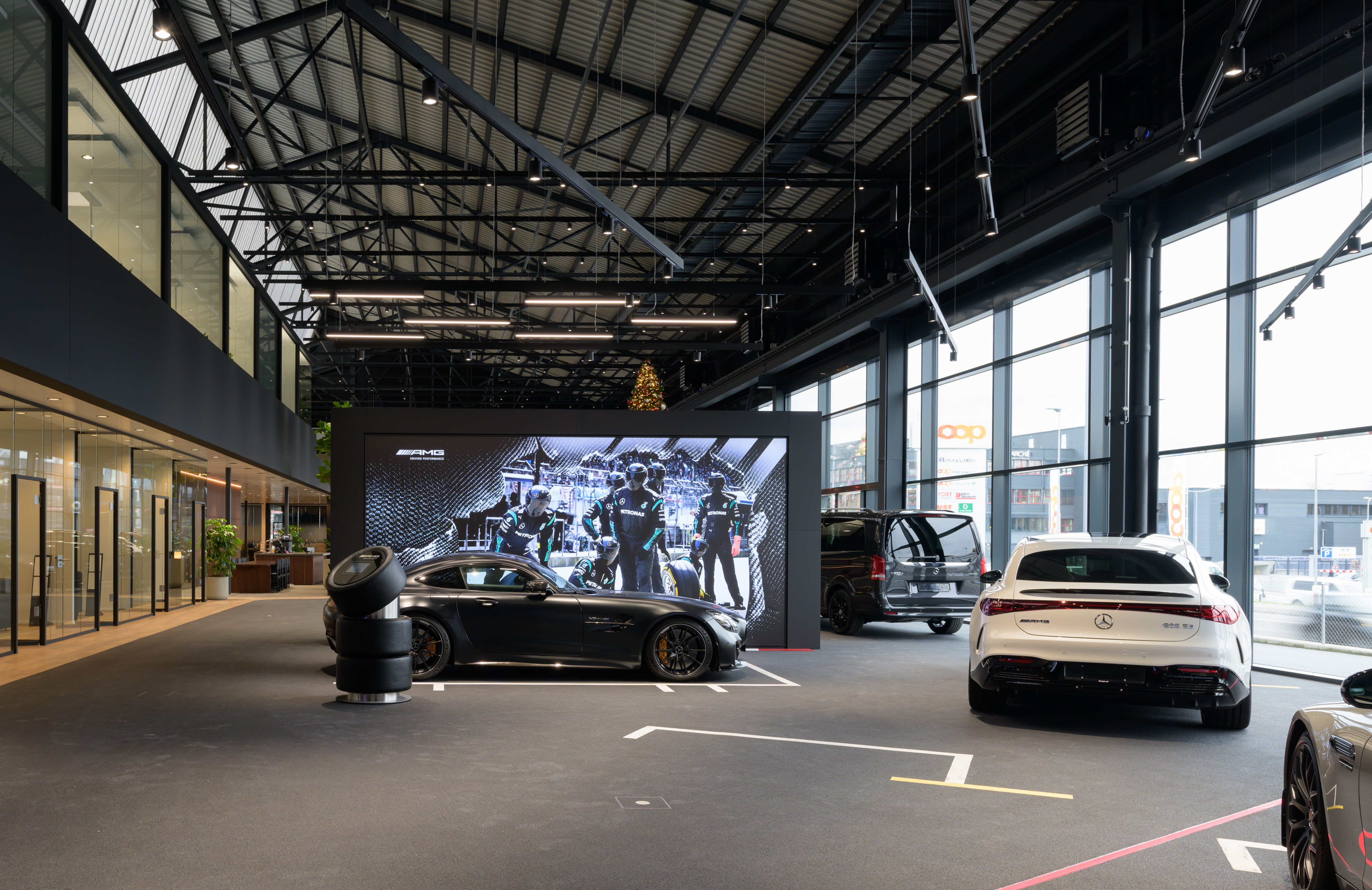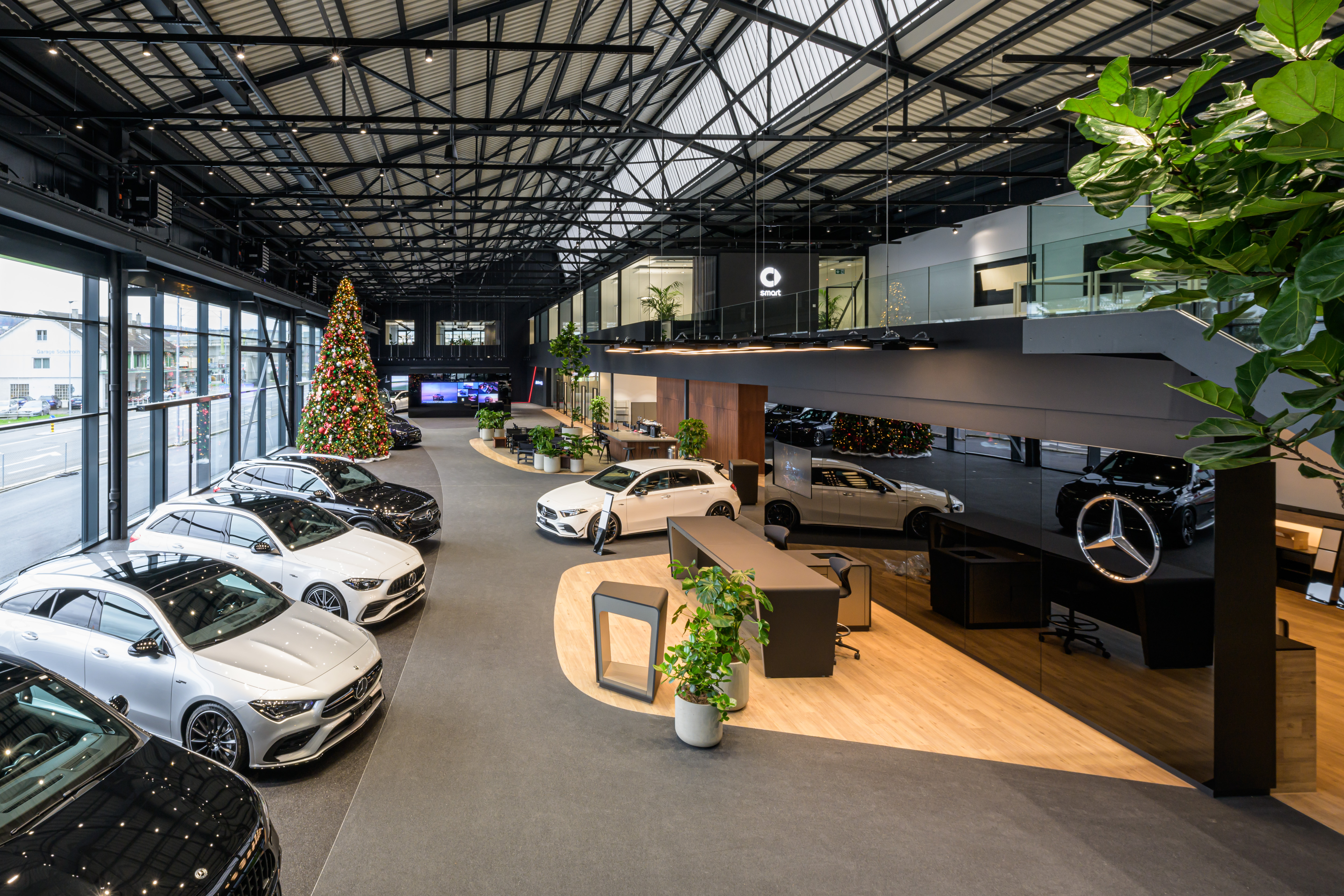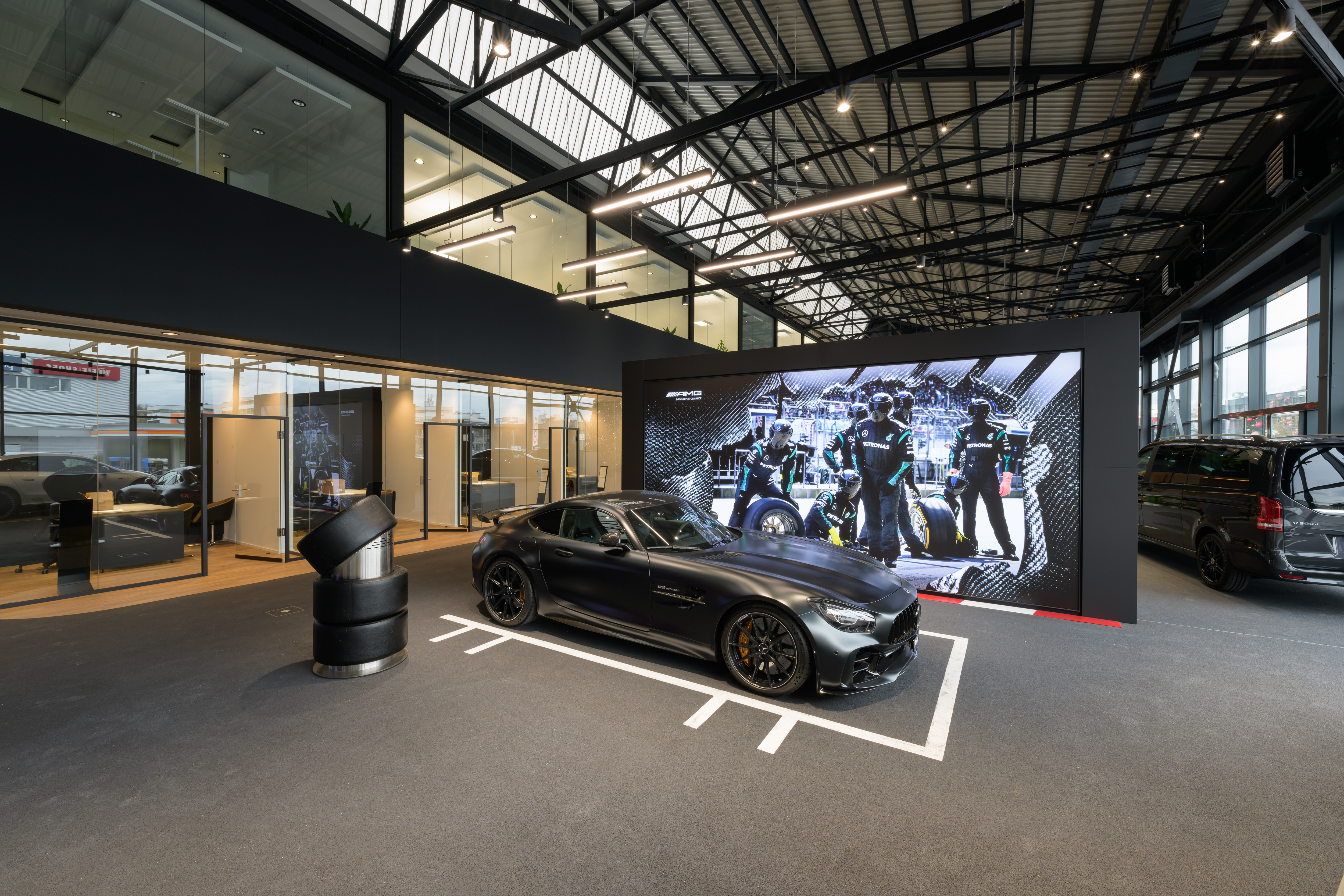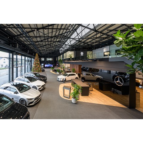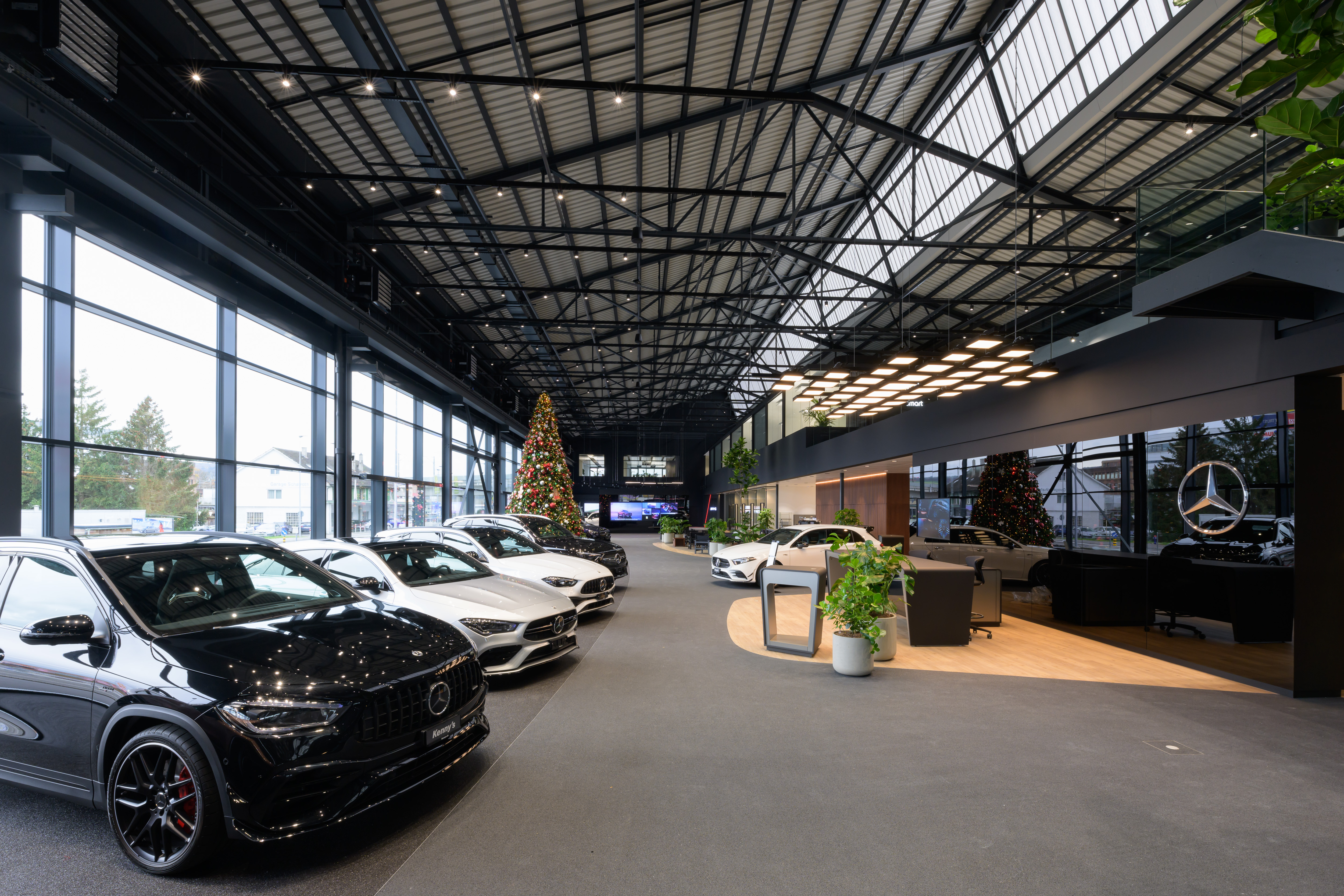 Im grosszügigen Showroom von 1200 m² werden Stromschienenstraher als Grundbeleuchtung eingesetzt und erzeugen ein briliantes Licht, welches die Fahrzeuge edel strahlen lässt. Ein besonderer Eyecatcher ist eine risige Konstruktion aus mehreren, kubischen PI-QUADRAT Sonderleuchten die über dem Empfang gependelt sind. Die Bürobereiche werden mit Downlights D70 und andererseits Stehleuchten LINEA von Glamox beleuchtet. Das Licht der Stehleuchten kann bei Bedarf individuell