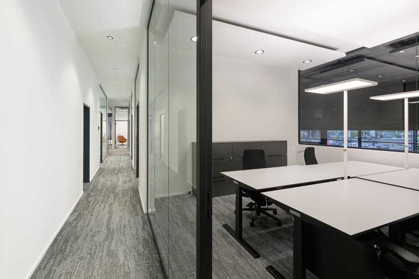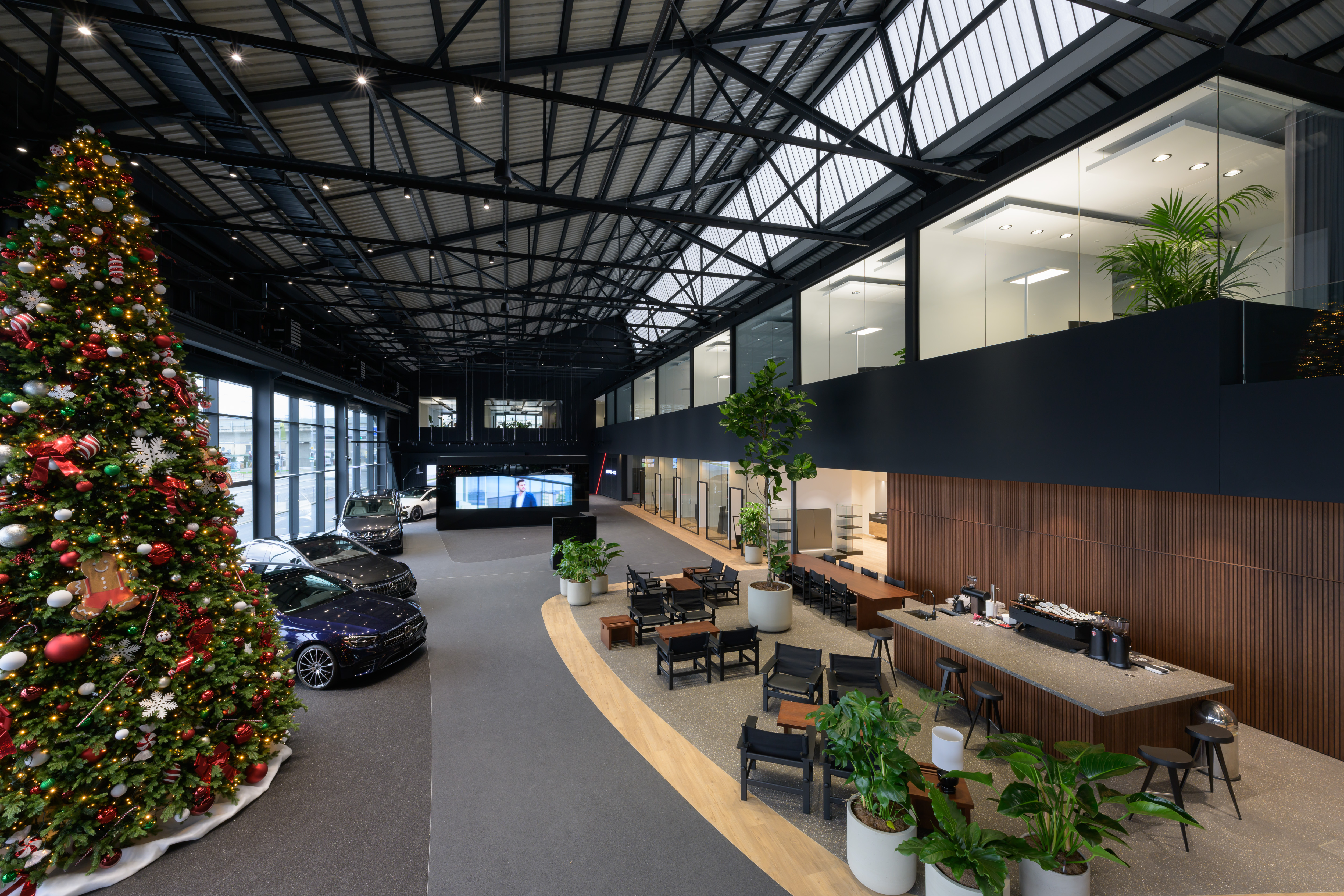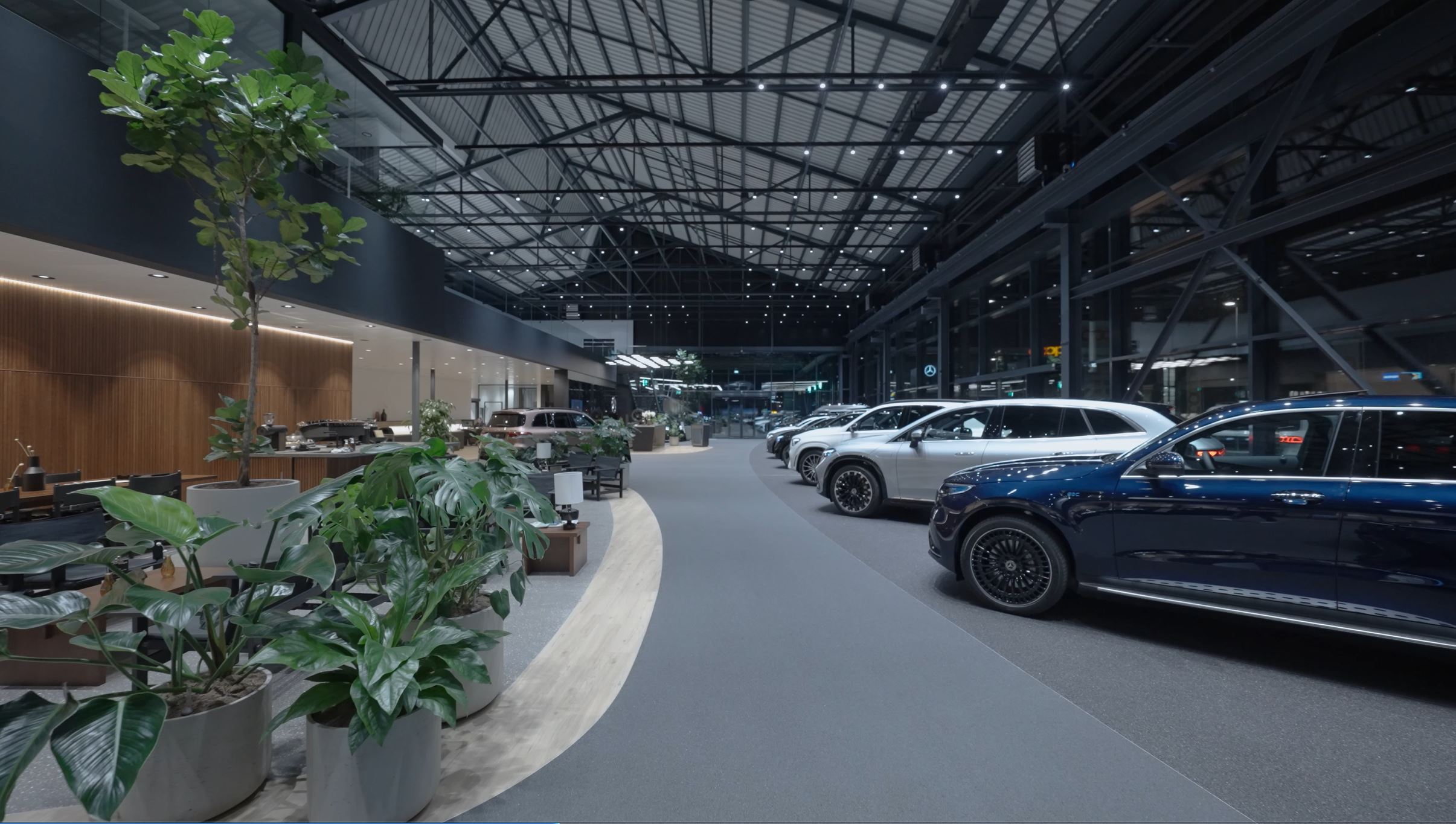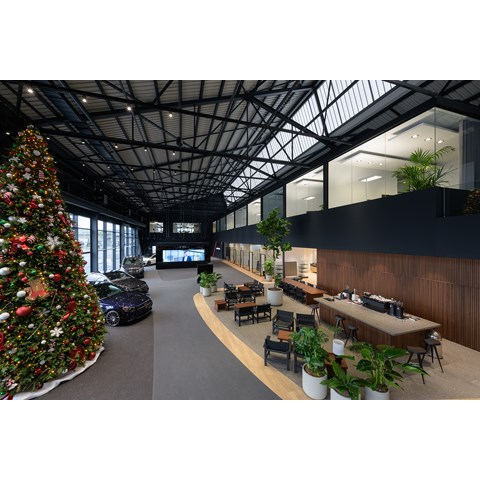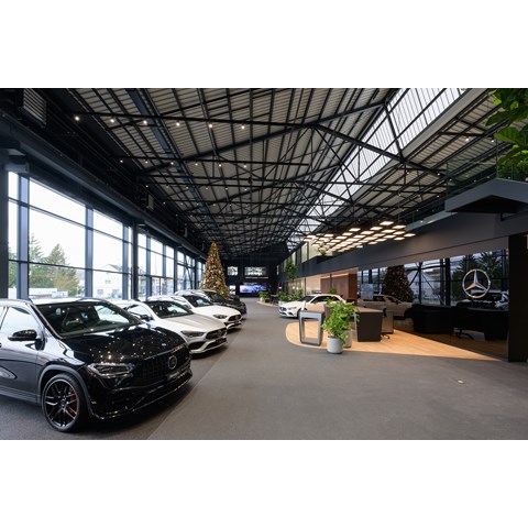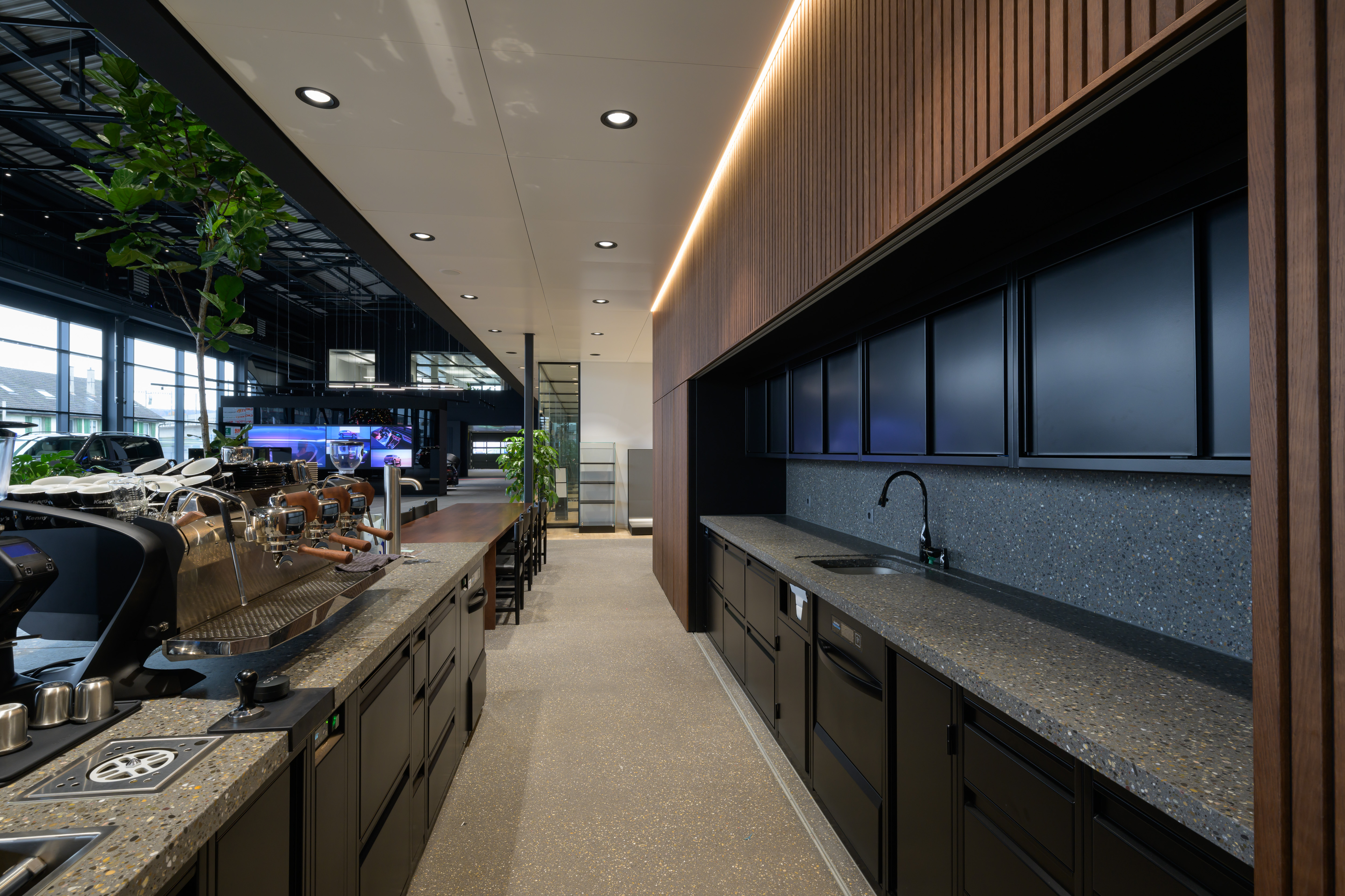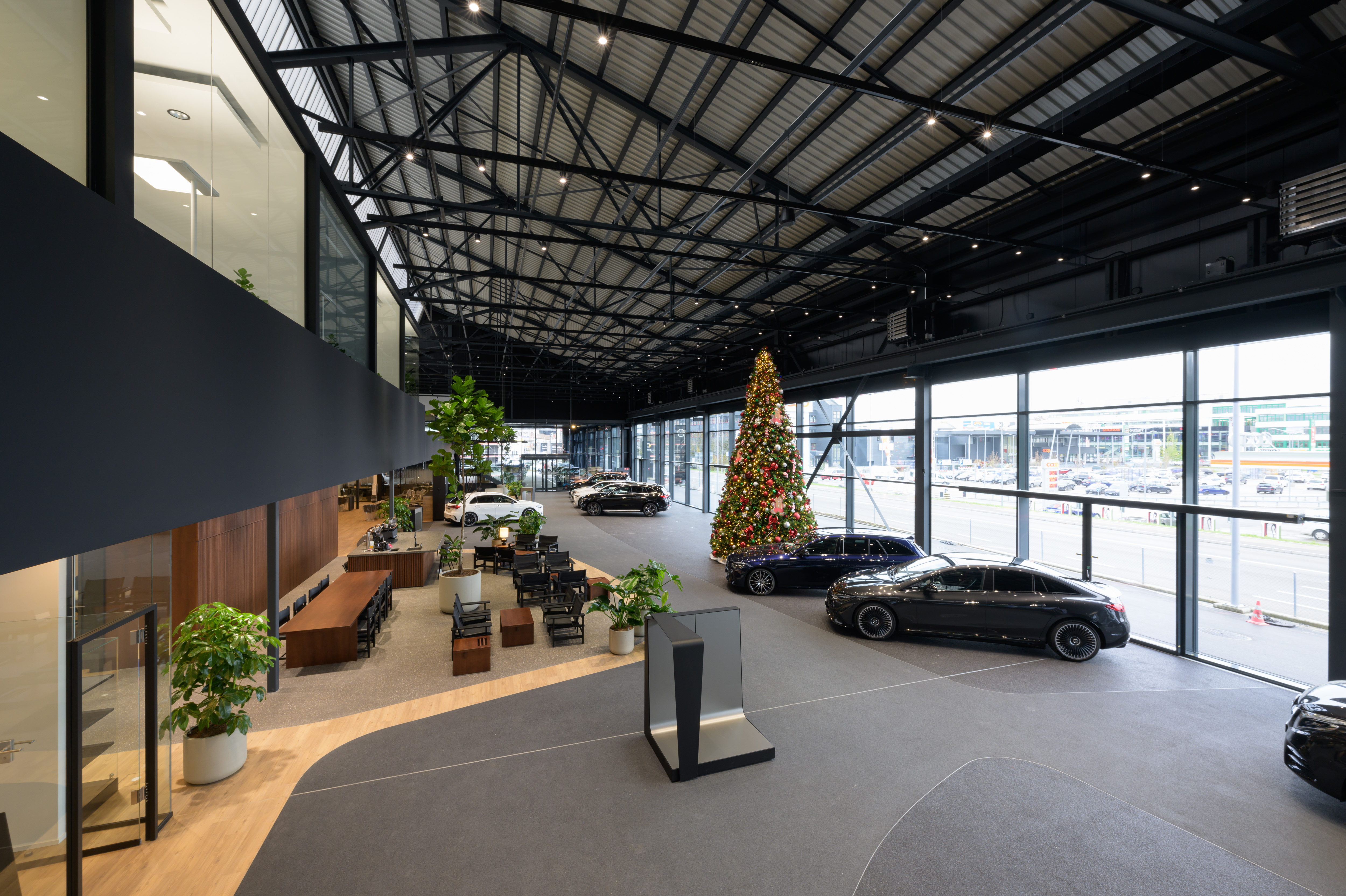 Im grosszügigen Showroom von 1200 m² werden Stromschienenstraher als Grundbeleuchtung eingesetzt und erzeugen ein briliantes Licht, welches die Fahrzeuge edel strahlen lässt. Ein besonderer Eyecatcher ist eine risige Konstruktion aus mehreren, kubischen PI-QUADRAT Sonderleuchten die über dem Empfang gependelt sind. Die Bürobereiche werden mit Downlights D70 und andererseits Stehleuchten LINEA von Glamox beleuchtet. Das Licht der Stehleuchten kann bei Bedarf individuell
