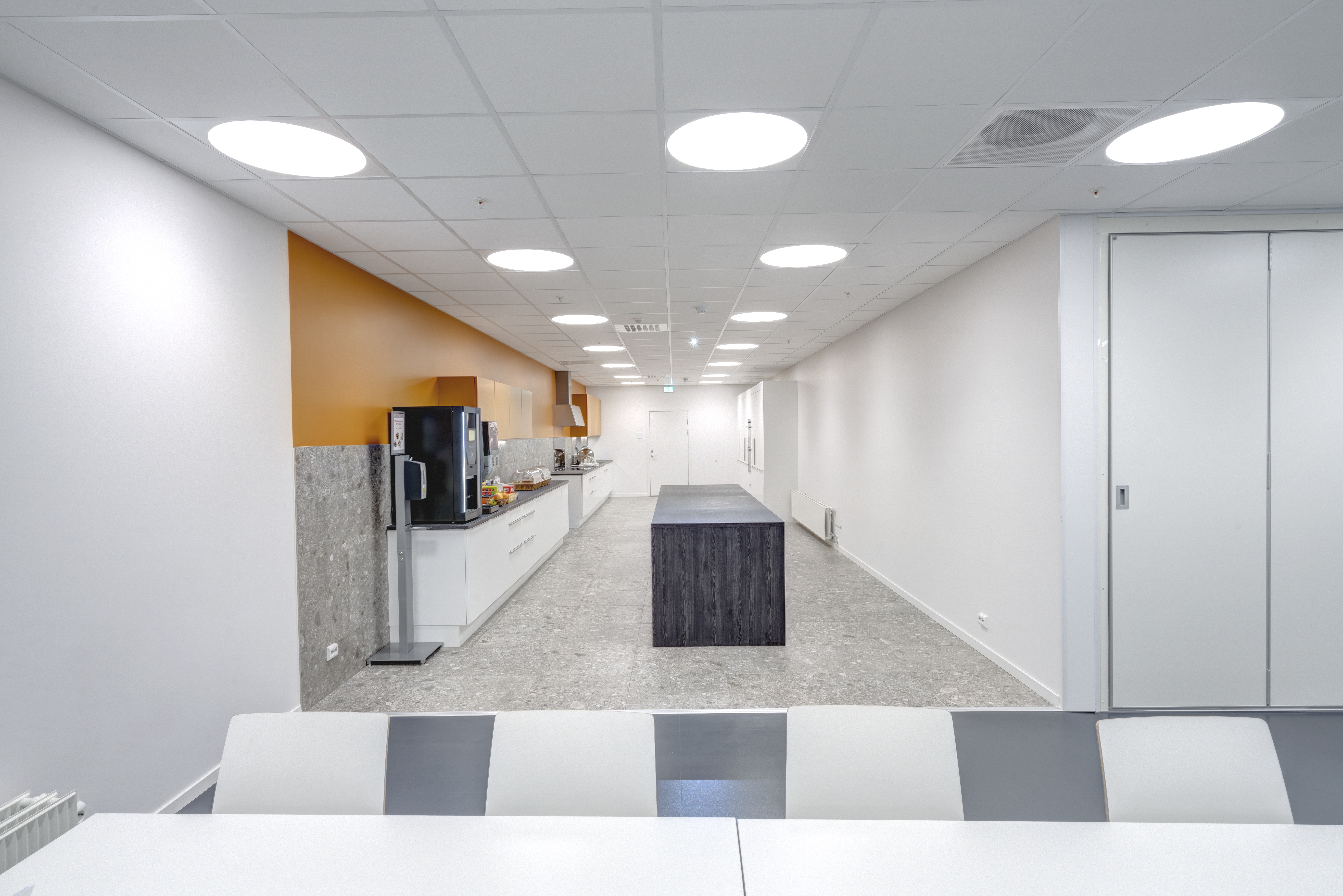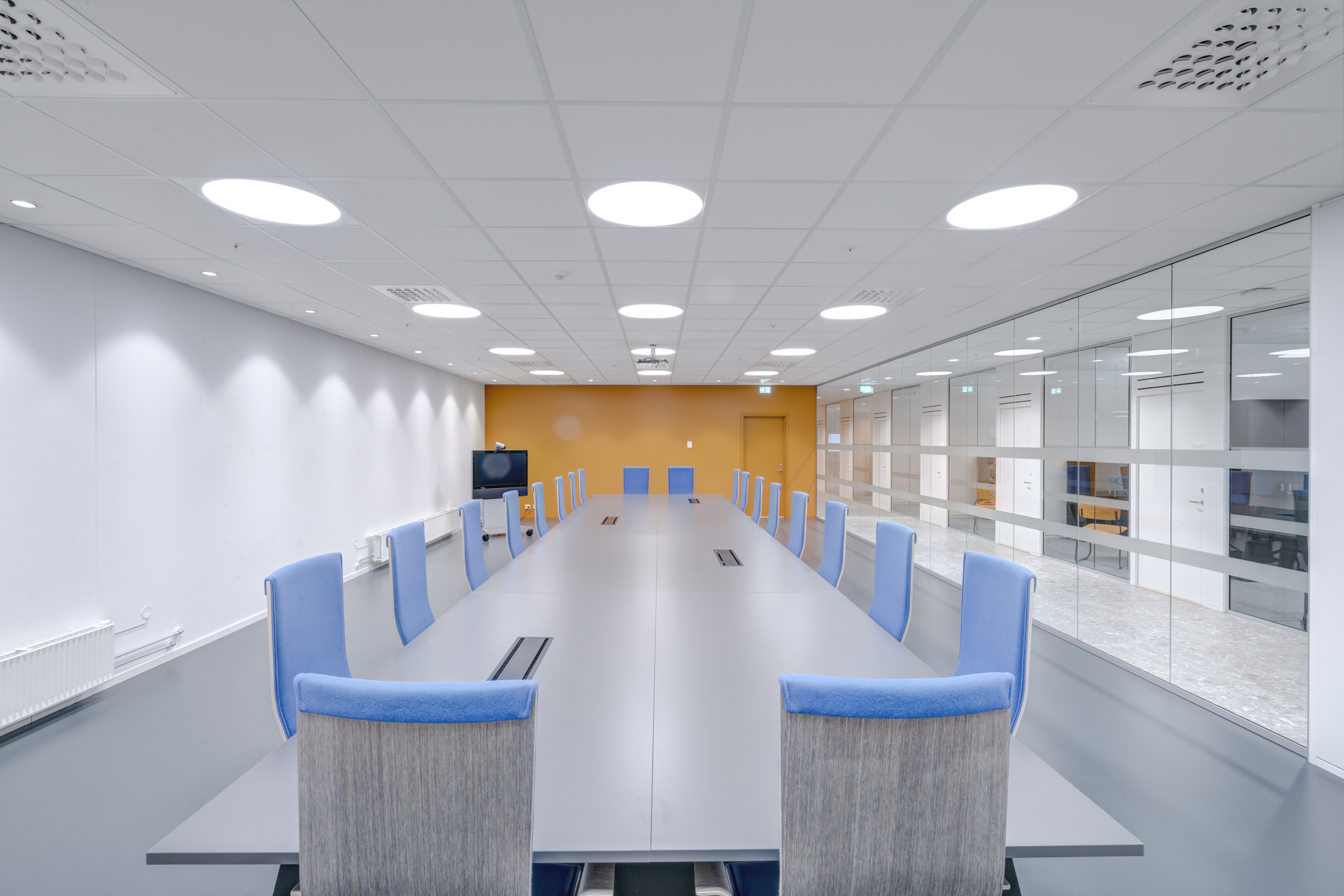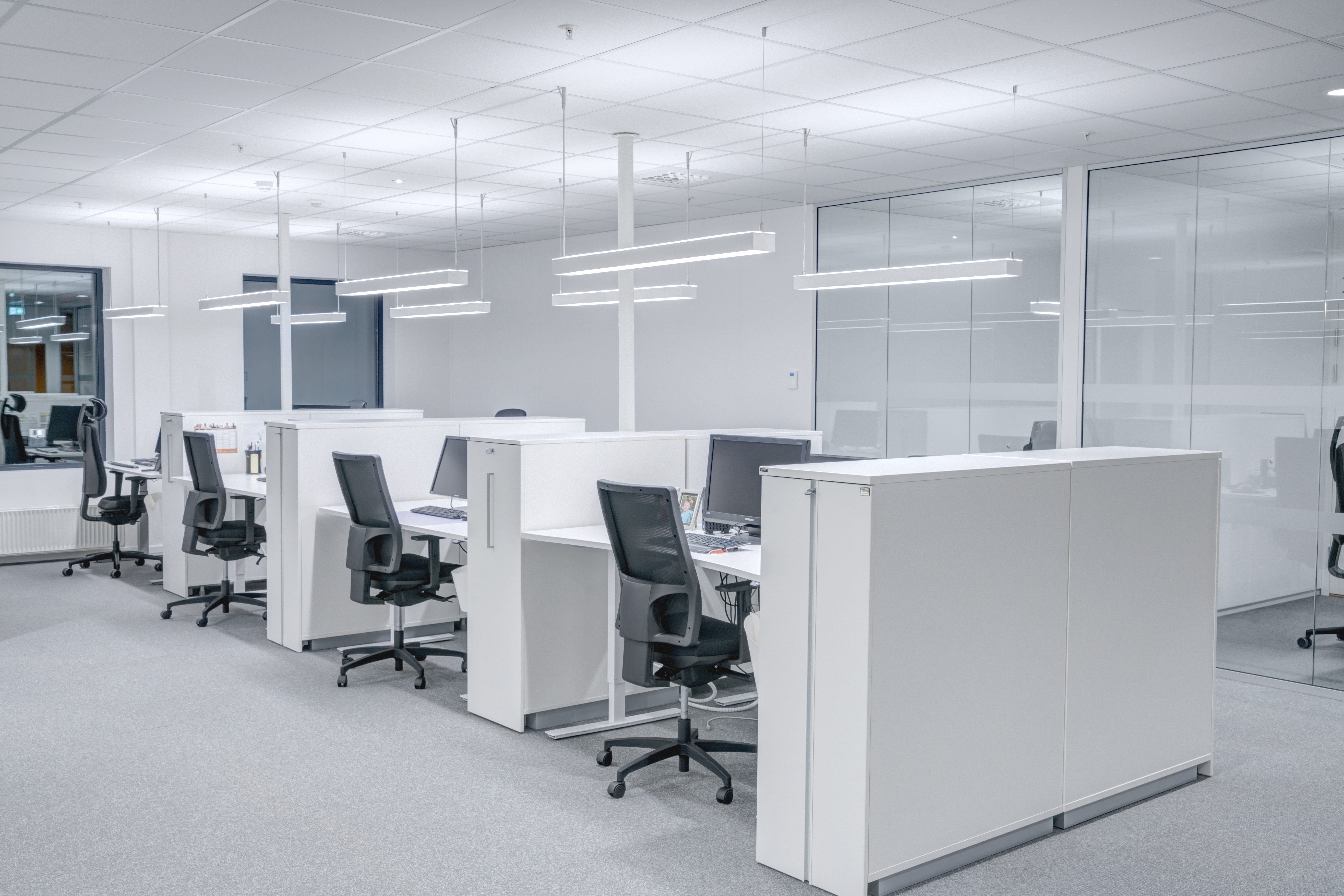 Das abgehängte Reed 1200 mit DALI wurde über den Arbeitsplätzen sowohl in den Grossraumbüros als auch in den Einzelbüros eingesetzt. Die Bürobereiche werden durch das Downlight D70-R155 ergänzt. Die Flure werden mit dem gleichen Downlight beleuchtet. Besprechungsräume verfügen über die Einbauleuchte C90 mit einer kreisrunden Lichtöffnung sowie ein kleineres Downlight des Typs D70-R108. Diese Art von Downlight wird auch zusammen mit der D70-R155 im Eingangsbereich eingesetzt. Der Ausstellungsraum wird mit C20-R625 LED mit Raster beleuchtet.