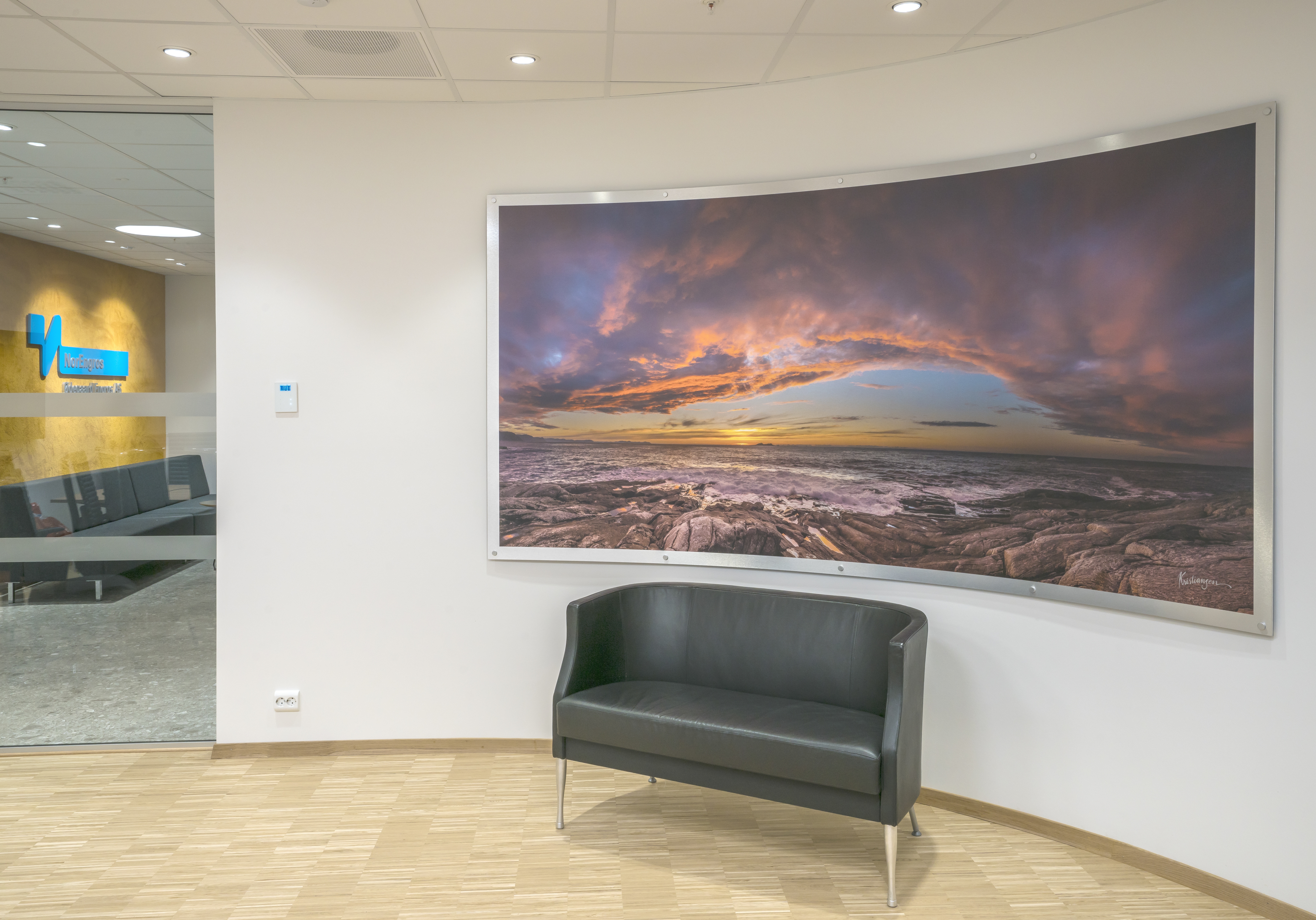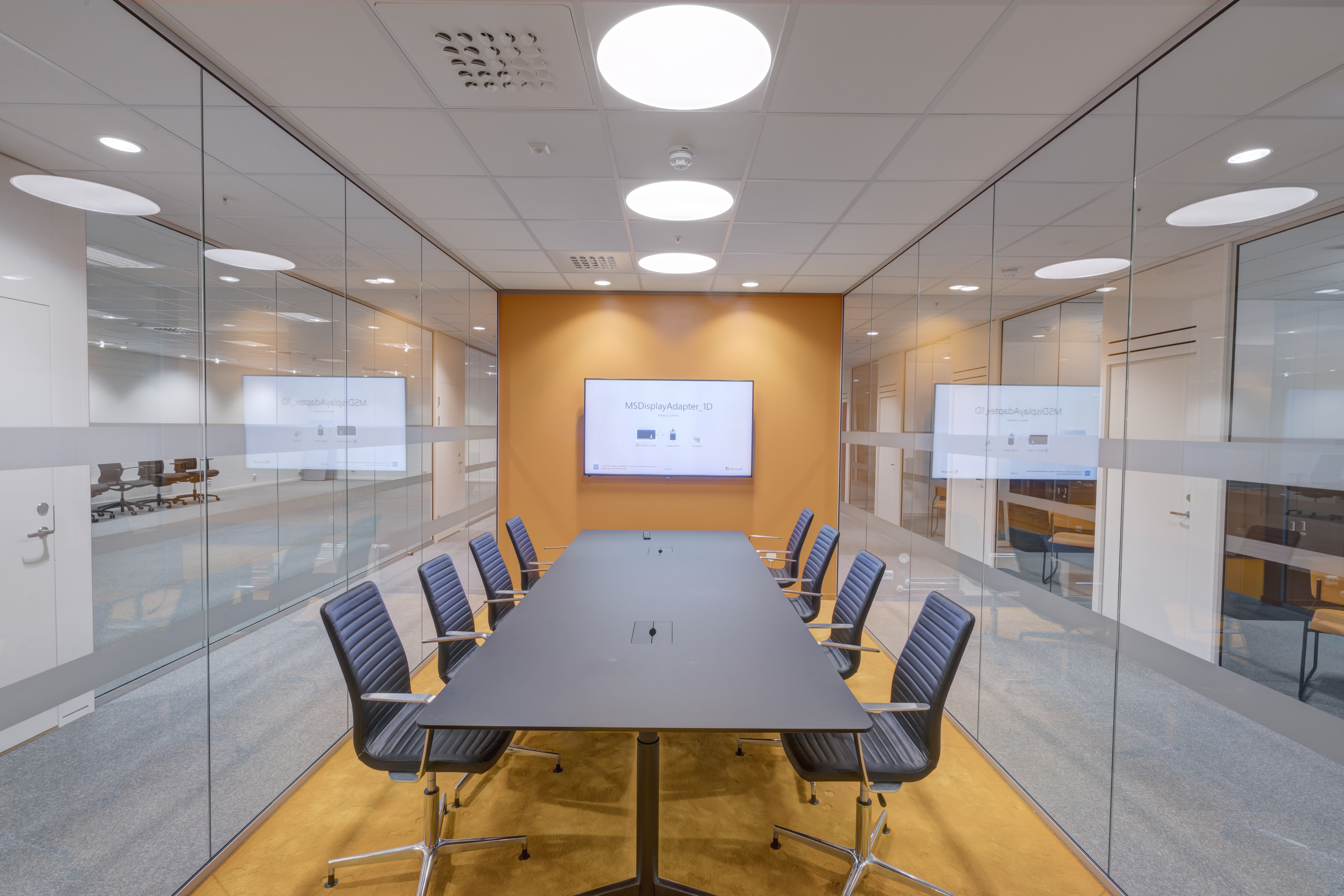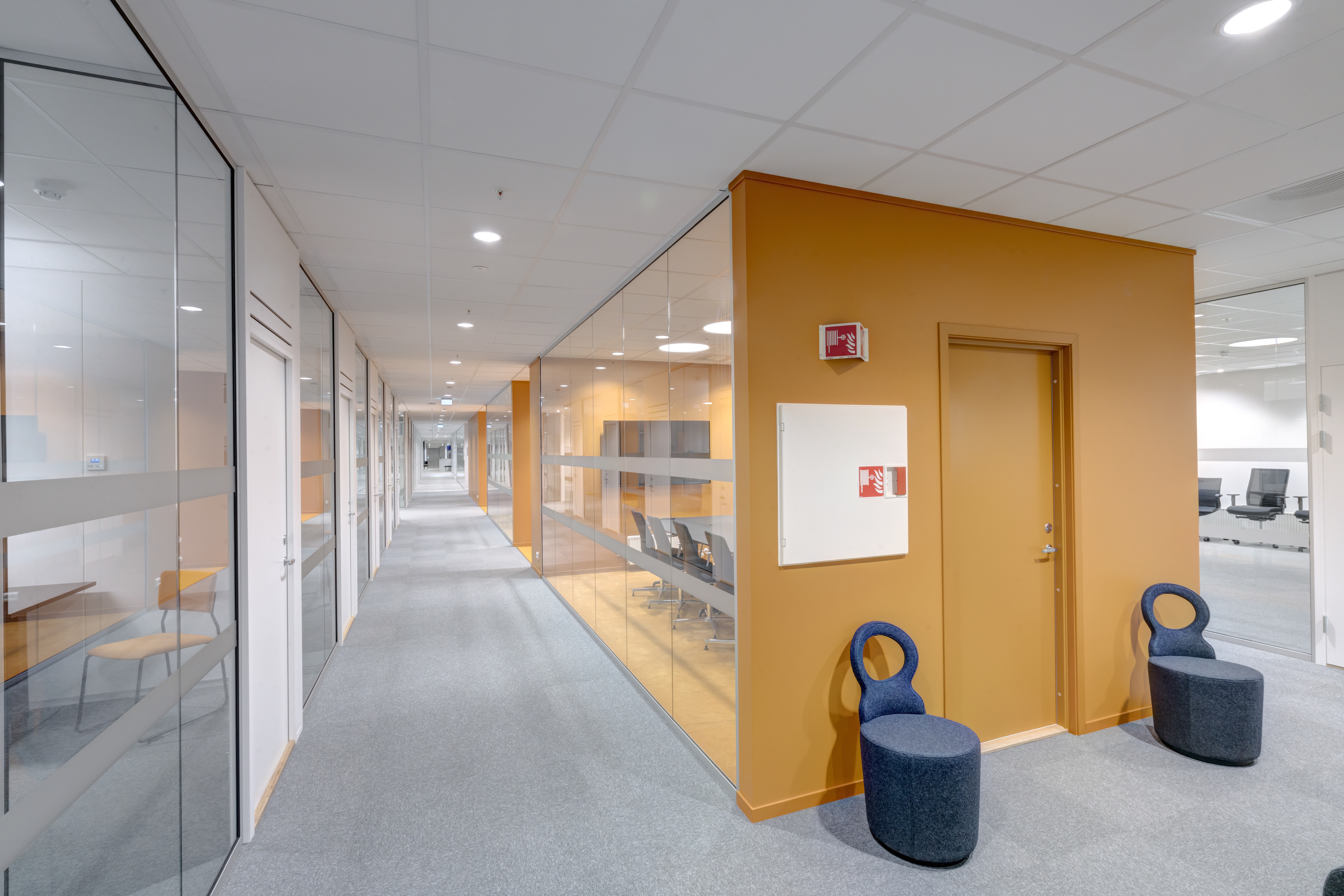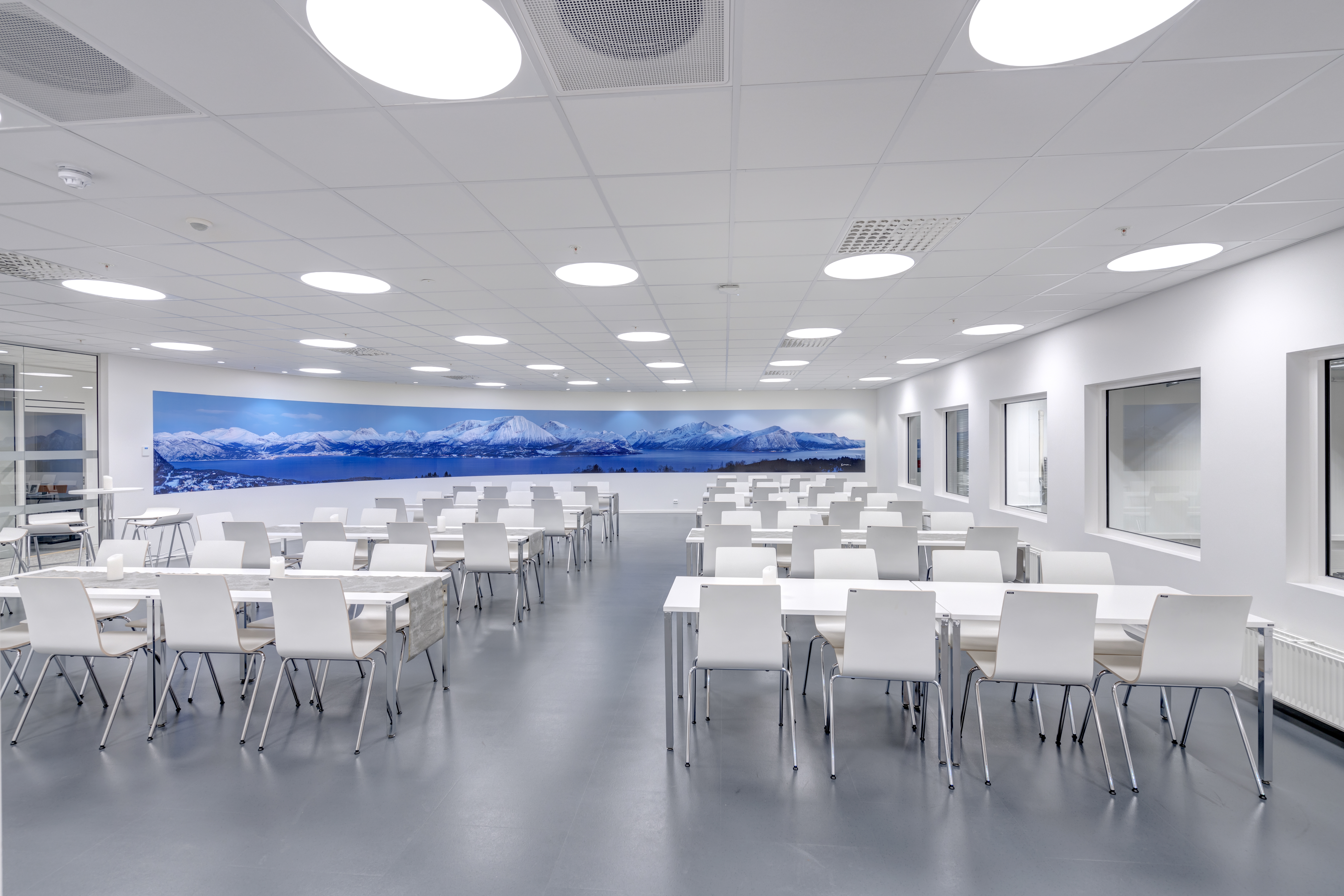 Das abgehängte Reed 1200 mit DALI wurde über den Arbeitsplätzen sowohl in den Grossraumbüros als auch in den Einzelbüros eingesetzt. Die Bürobereiche werden durch das Downlight D70-R155 ergänzt. Die Flure werden mit dem gleichen Downlight beleuchtet. Besprechungsräume verfügen über die Einbauleuchte C90 mit einer kreisrunden Lichtöffnung sowie ein kleineres Downlight des Typs D70-R108. Diese Art von Downlight wird auch zusammen mit der D70-R155 im Eingangsbereich eingesetzt. Der Ausstellungsraum wird mit C20-R625 LED mit Raster beleuchtet.