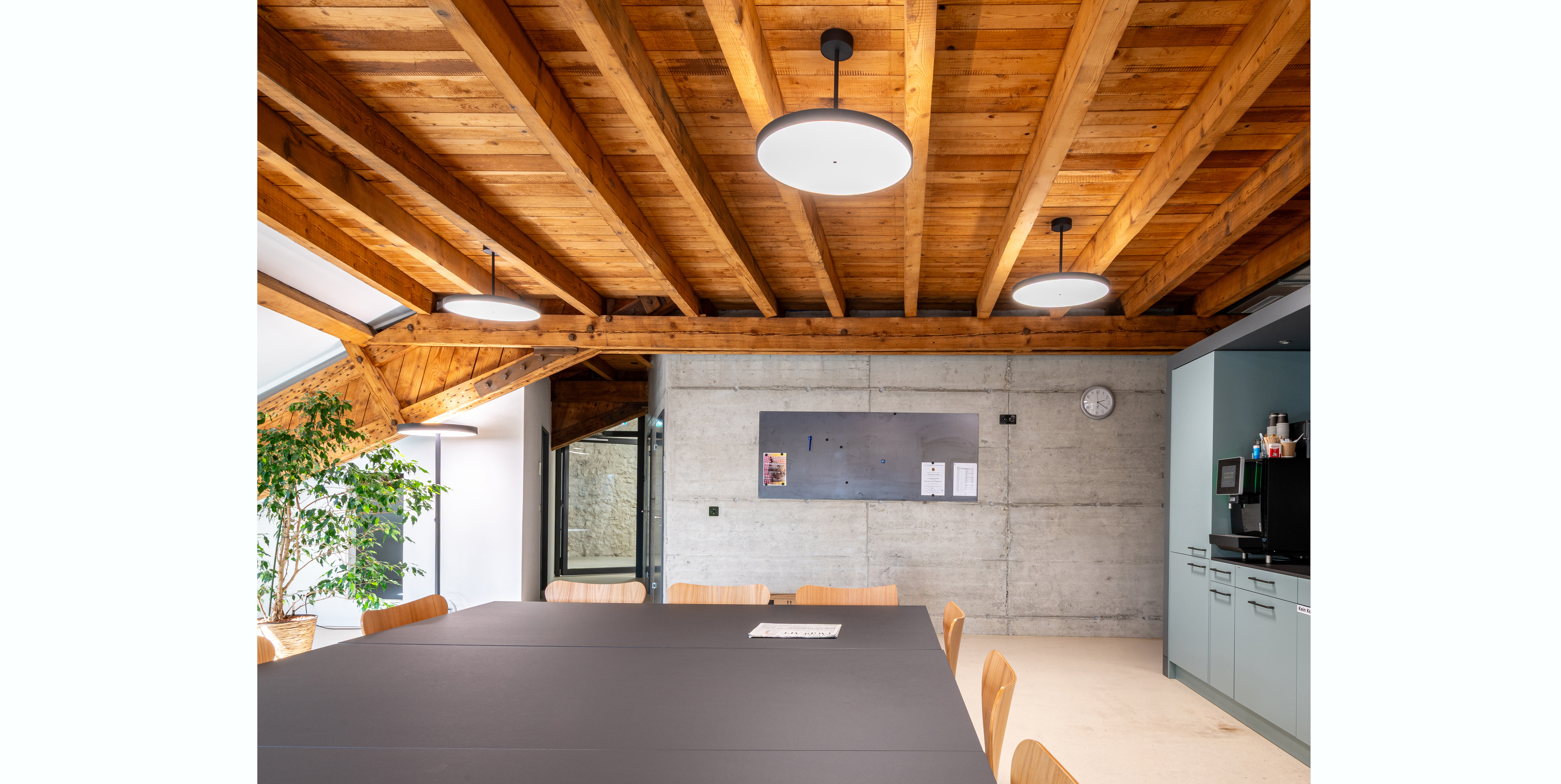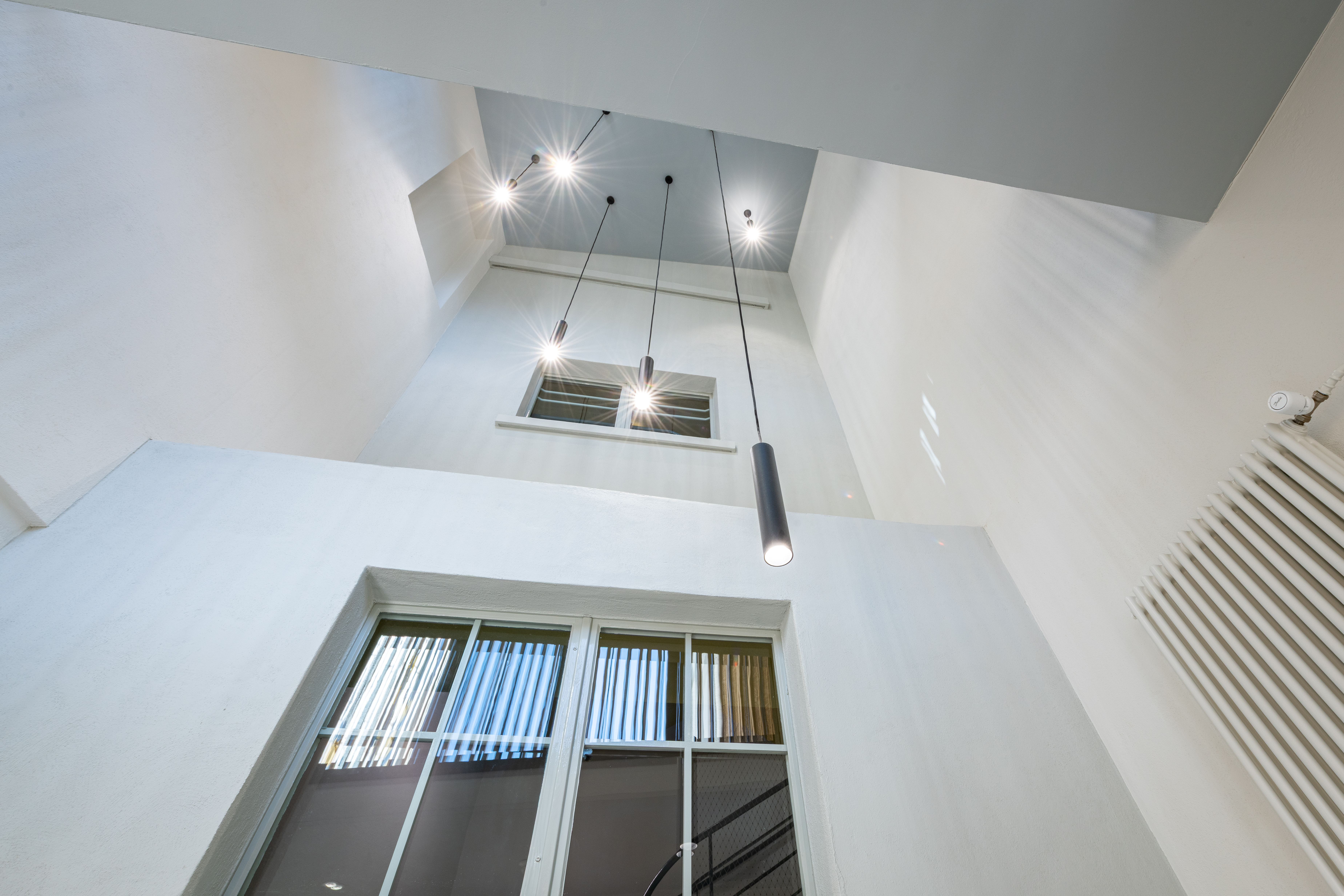 Ein besonderes Highlight ist der neu geschaffene Durchgang zwischen dem Winkelgebäude und dem Rathaus. Im Luftraum dieses Bereichs wurde eine funktionale und gleichzeitig dekorative Beleuchtung installiert. Filigrane, zylindrische Leuchten, die in unterschiedlichen Höhen pendeln, erhellen diesen Raum auf verspielte Weise.