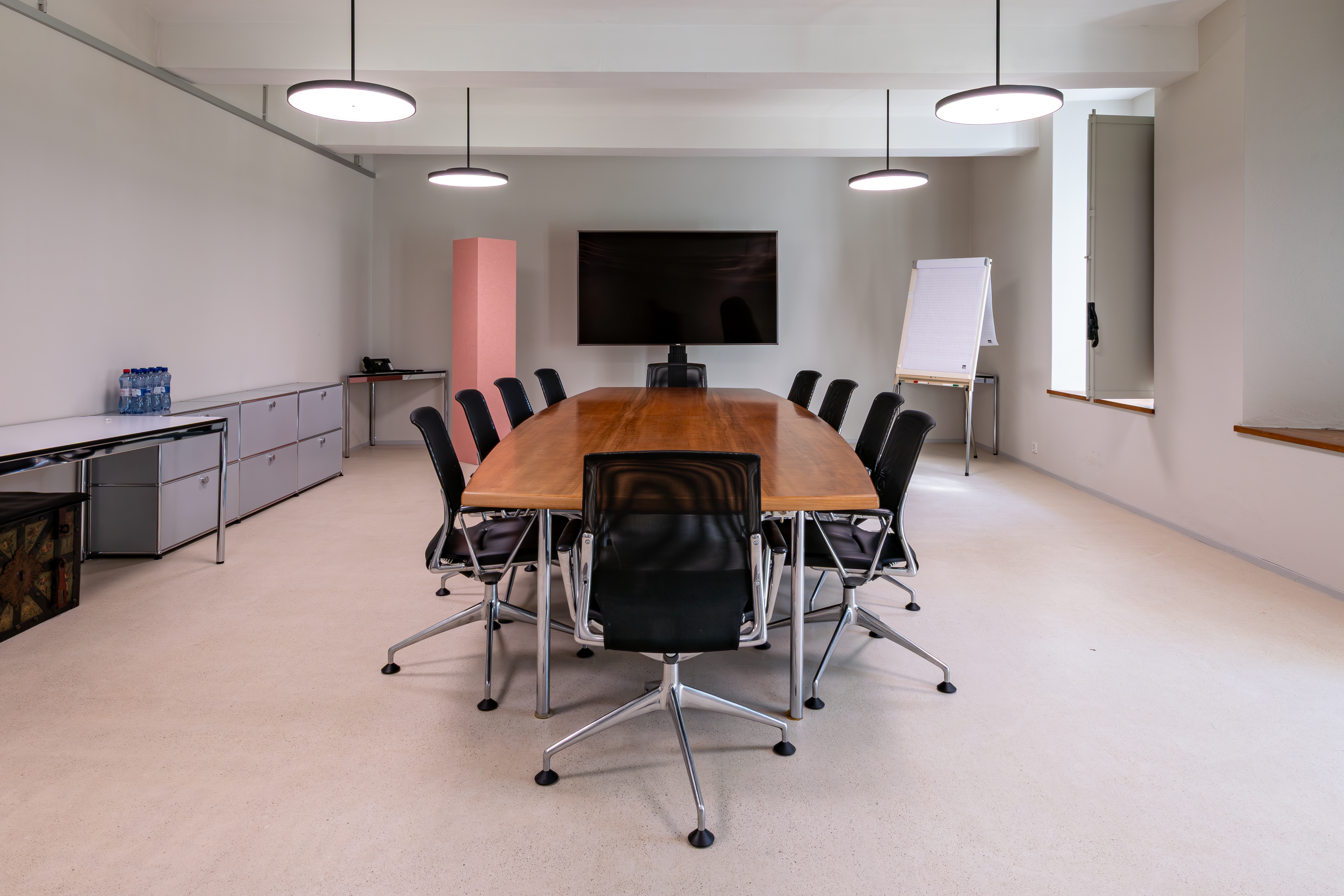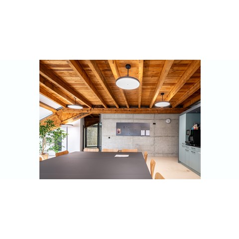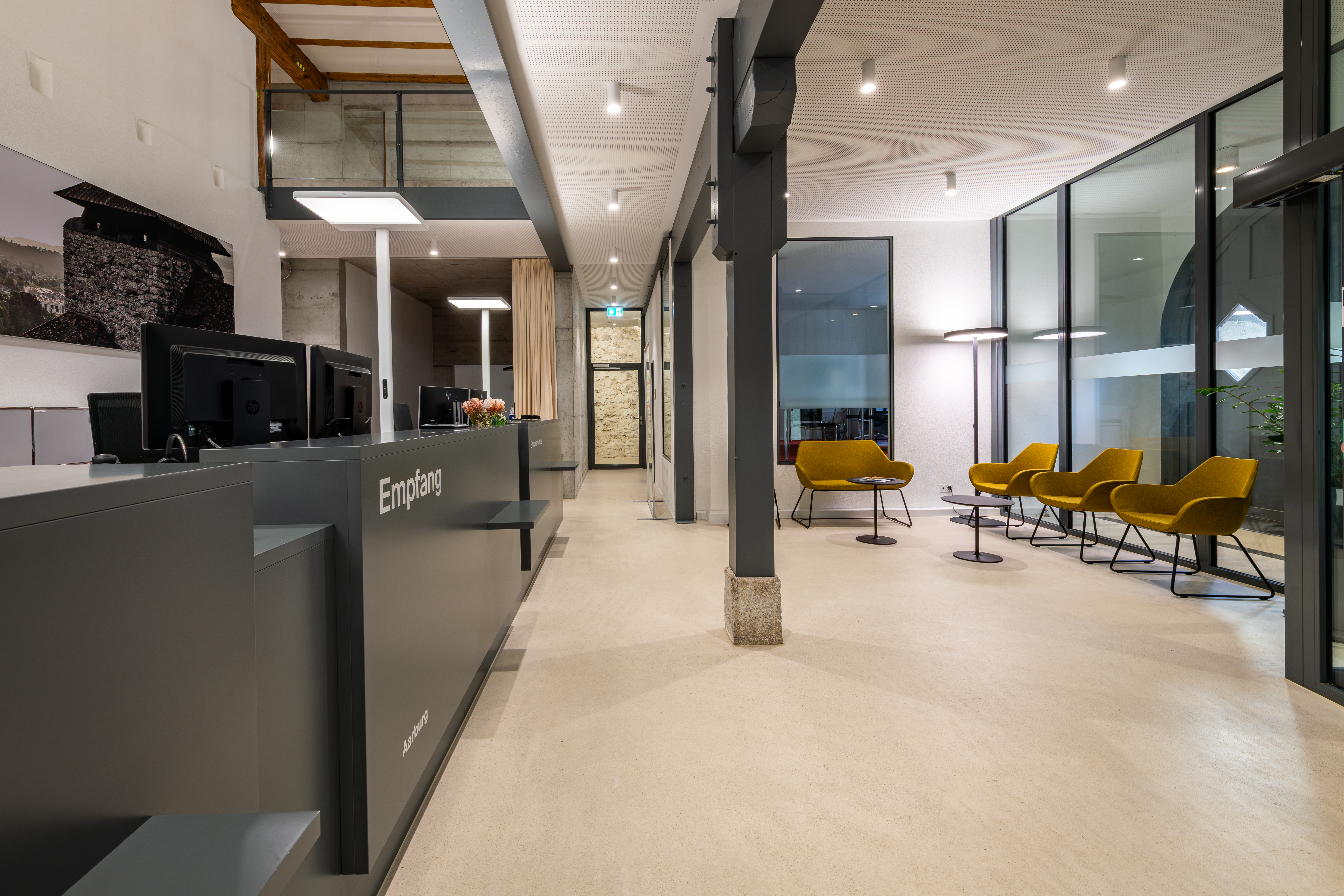 Auch die zahlreichen Rundleuchten in den Empfangsbereichen, Sitzungszimmern und Aufenthaltsräumen fügen sich optimal ins Gesamtbild ein. Trotz ihres modernen Designs verleiht ihnen die anthrazitfarbene Oberfläche eine metallische Anmutung, die sehr gut zu den geschichtsträchtigen Räumlichkeiten passt. An zentralen Stellen wurden zusätzlich Stehleuchten im gleichen Stil eingesetzt, was ein einheitliches Gesamtbild schafft.