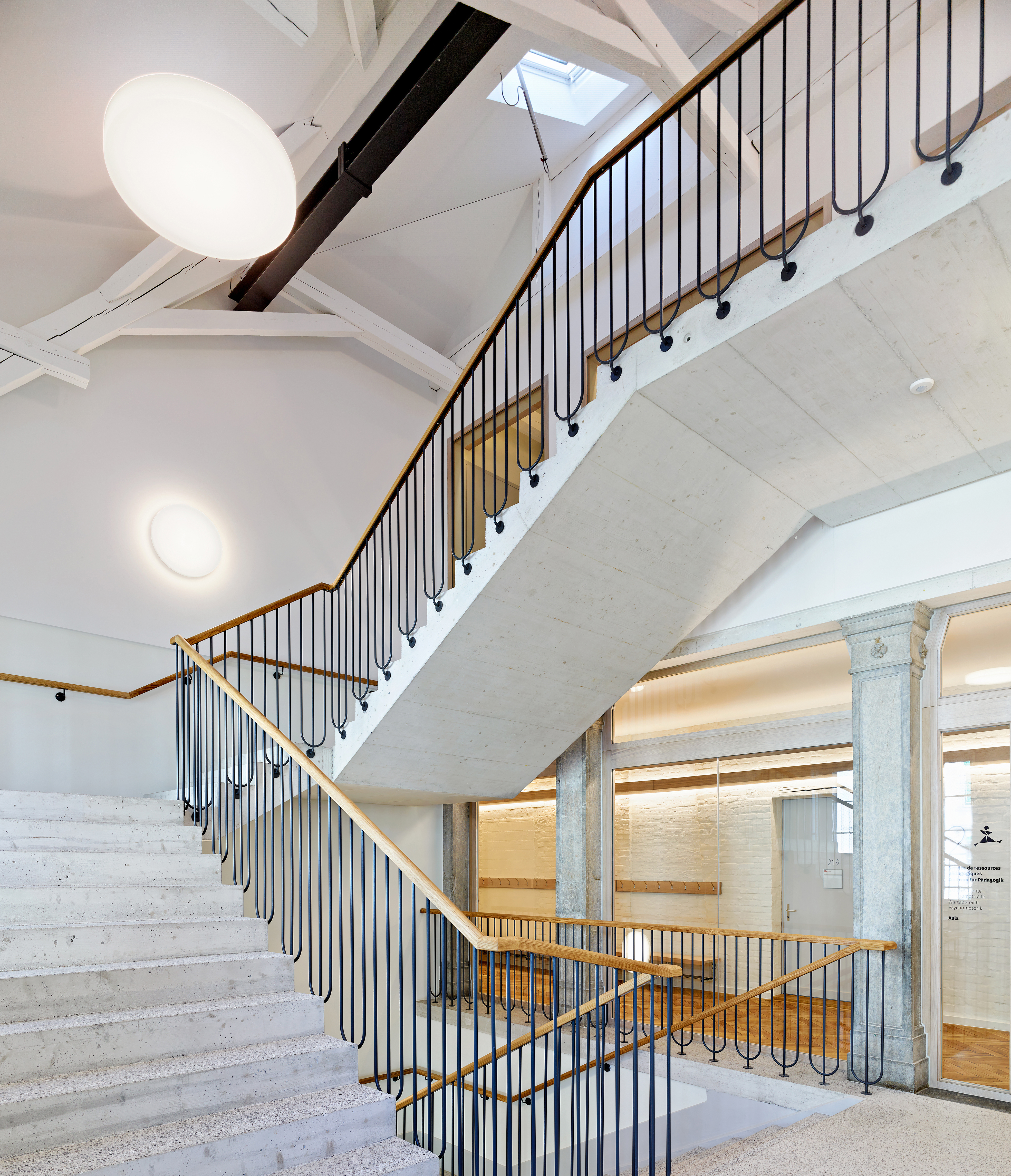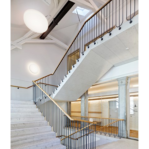 Das grosszügige und offene Treppenhaus im Eingangsbereich ist mit schlichten, vollopalen Rundleuchten beleuchtet. Diese wirken leicht und das diffuse Licht erhellt den Raum sanft. Entlang der Korridore mit den schönen alten Säulen, führt ein lineares Licht. Die Holzelemente an der Wand wurden mit LED-Profilen bestückt, die speziell in der hauseigenen Produktion der Glamox AG ge-fertigt wurden. Das Licht das direkt und indirekt in den Raum verteilt wird, führt so intuitiv durch den Raum.