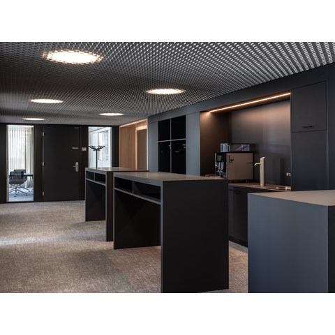 Die Sondereinbauleuchten, die hinter der Rasterdecke montiert sind, sorgen im Korridor und Pausenbereich für stimmiges Licht. Die Einbau-LED-Profile Smart LED 3030 betonen bestimmte Einbaumöbel diskret.