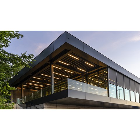 Die grosse Fensterfront mit Aussicht auf den Sportplatz sorgt für eine optimale Tageslichtnutzung. Der Eingangsbereich ist mit seitlich in der Decke eingelassenen Profilen SMARTLED 6050 ausge-leuchtet. Linienleuchten weisen klar den Weg ins Gebäude.