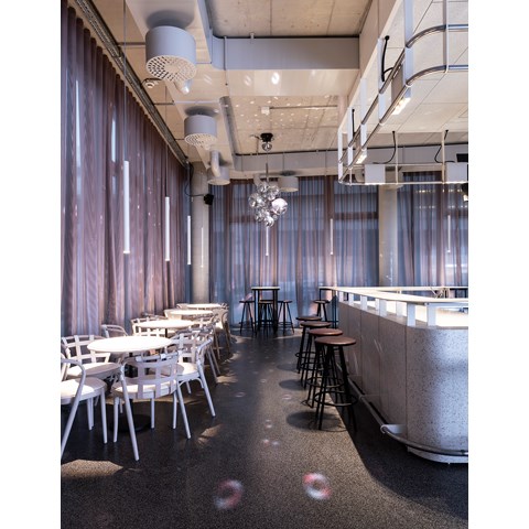 In der Cafeteria mit Bar und Live-Bühne wird die gemeinsame Vision durch eine, auf die speziellen Anforderungen angepasste, DMXgesteuerte, Cameleon-Leuchten von ES-System Realität. Die abgependelten Leuchten sorgen zu jeder Tages- und Nachtzeit für ein pulsierendes Barambiente. Die ruhige, klare Optik der Cameleon fügt sich stilvoll in den Raum ein und verbindet mit ihrer, an eine Orgelpfeife erinnernden, zylindrischen Form die zwei Grundideen des Gestaltungskonzepts: Klang und Ästhetik. Der zentrierte Lichtkegel der Cameleon leitet den Lichtstrom mittig auf den Tisch, ohne die gewünschte Grundbeleuchtung im Raum zu beeinträchtigen oder den Blick auf die Bühne zu stören. Im Barbereich wurden maximal flexible, sonderangefertigte Lichtboxen installiert, die mit wenigen Handgriffen auf einer Schiene hin und her geschoben werden können. Tisch-, Bar- und Bühnenbeleuchtung sind über ein DMX-Lichtsystem miteinander verbunden, das per Knopfdruck verschiedenste Lichtanimationen und Szenen aufbaut: beispielsweise helle, freundliche Szenen während eines Events am Mittag oder eine subtile, düstere Stimmung bei einem Metal-Konzert am Abend.