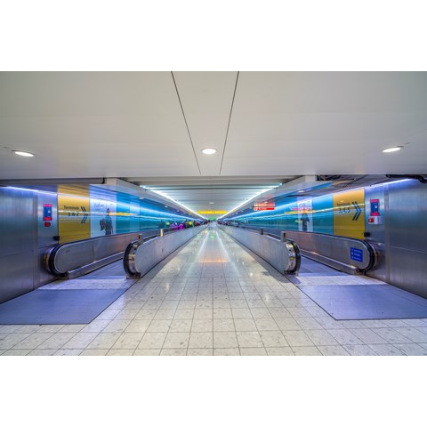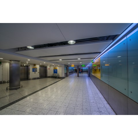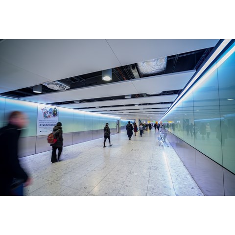 Die U-Bahn-Passagierbrücken der Terminals in Heathrow wurden durch eine Kombination von linearen Leuchtstoffröhren und Ein- und Aufbau CFL-Downlights beleuchtet. U-Bahn-Transfere waren keine besonders angenehme Erfahrung für die Passagiere. Es war wichtig, dass wir das Licht in diesem Bereich verbessern.