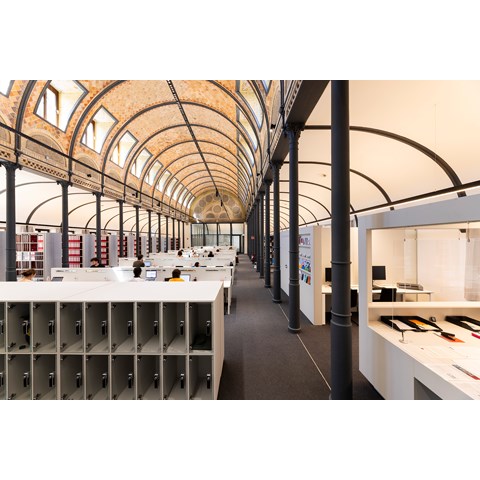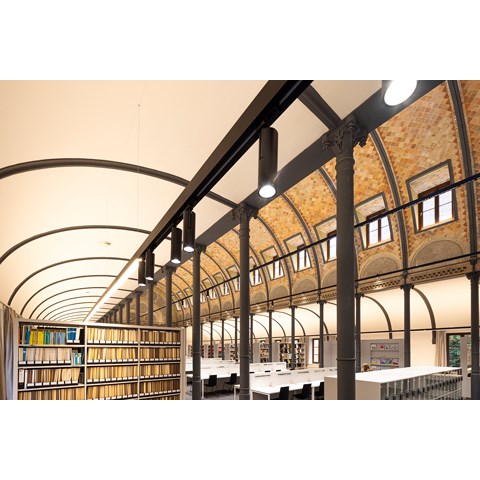 Im Mittelschiff bietet über die gesamte Raumlänge das Linearsystem FX45-P ein elegantes und zeitloses Design, das sich bestens in die historischen Räumlichkeiten einfügt. Die Pendelleuchten sorgen mit schwarzen Rasterblenden nicht nur für eine erhebliche Entblendung und angenehmes direktes Arbeitslicht, sondern illuminieren gleichzeitig mit indirektem Licht die Backsteindecke des Lesesaals. Sie unterstreichen so die fantastische Wirkung des in einer Mischung aus Rundbogenstil und englischer Gotik errichteten Saales und seiner Obergaden-Fenster.