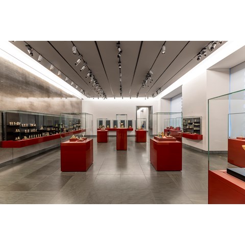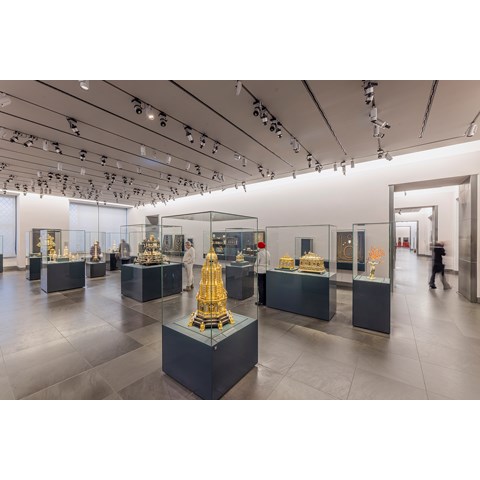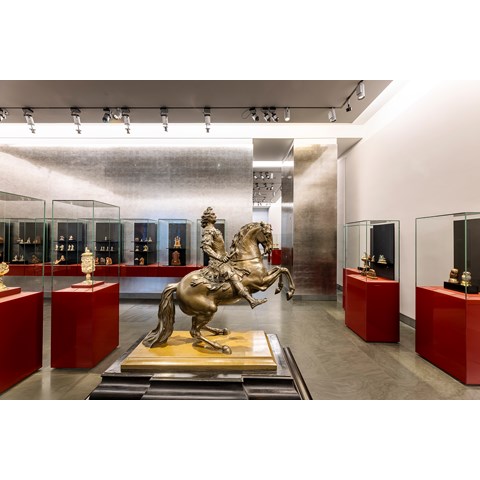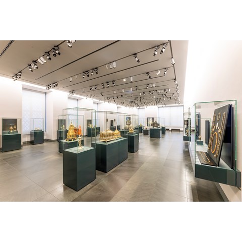 Im Erdgeschoss des Residenzschlosses tauchen die Besucher in die authentisch wiederhergestellten Räume der Schatzkammer ein. In der zweiten Etage funkeln besondere Einzelstücke in doppelt entspiegelten, klimatisierten Vitrinen. Die Oberflächen der gezeigten Unikate werden durch eine hochmoderne Lichttechnik mit präzise ausgerichteten Leuchten adäquat in Szene gesetzt. Doch nicht nur die Unikate strahlen, sondern auch die Räume.