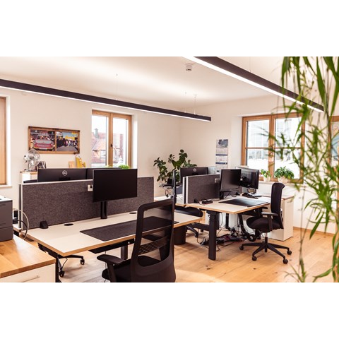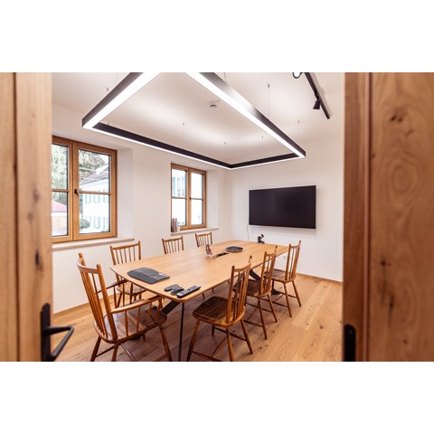 Geplant wurde mit Leuchten in einer klaren, eckigen Formensprache und der Gehäusefarbe schwarz, die sich perfekt mit den natürlichen Oberflächen von Holz und Stein ergänzt. Da die Raumhöhe dies zuließ, konnte in den Büroräumen die Profilleuchtenserie Glamox C80-P/PR mit ihrem elegant-schlichtem Design in verschiedenen Längen und rechteckigen Anordnungen zum Einsatz kommen.