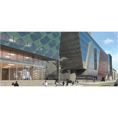 The Grand Canal Square Theatre and Commercial Development in Dublin features a 2,000-seat performing arts centre which is integrated into a commercial area via two office blocks that include 375,000-square-foot of leasable office and retail space. This is located at the heart of the Grand Canal Harbour development and creates a focal point for Grand Canal Square.