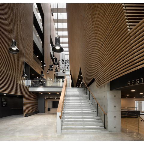 Ensimmäisen kerroksen aulassa on koko rakennuksen korkuinen ja kattoikkunoihin ulottuva atrium-tila, joka tulee näyttävästi esiin eri tasoihin ripustettujen A90-valaisimien valossa.