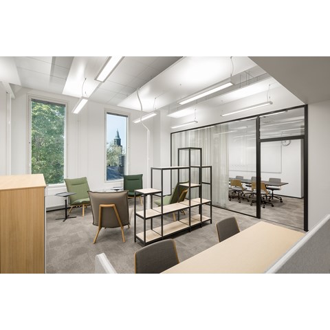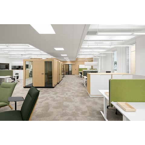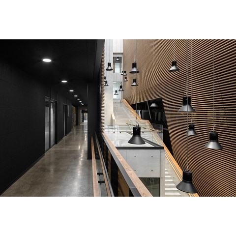Monitilatoimistojen kattoon upotetut C25-moduulivalaisimet sekä ripustetut C70-valaisimet takaavat hyvät näköolosuhteet niin työpisteisiin, neuvottelutiloihin kuin vapaamman oleskelun alueille. Kompaktisti muotoillut, upotetut D35-alasvalot luovat käytäville tasaisen ja miellyttävän valon.