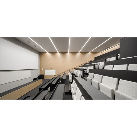 ”Luentosalissa on tärkeää, että valaistus taipuu ohjauksen avulla sekä esitys- että esiintymistilanteisiin. Valoviivat tuovat riittävästi valoa myös pystypinnoille, kuten esiintyjien kasvoille. Valaisintehot on sovitettu tilan korkeuden mukaan niin, salin etuosassa on suuri- ja takaosassa pienitehoisempia valaisimia.”