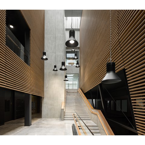 ”Aulassa on erilaisia alueita monenlaista toimintaa ja oleskelua varten. Kaikkien ripustusvalaisimien ulkonäkö, muoto ja mitat ovat samat, mutta eri valaisintehojen ja optiikoiden avulla valaistus saatiin sovitettua kunkin alueen tarpeita vastaavaksi.”