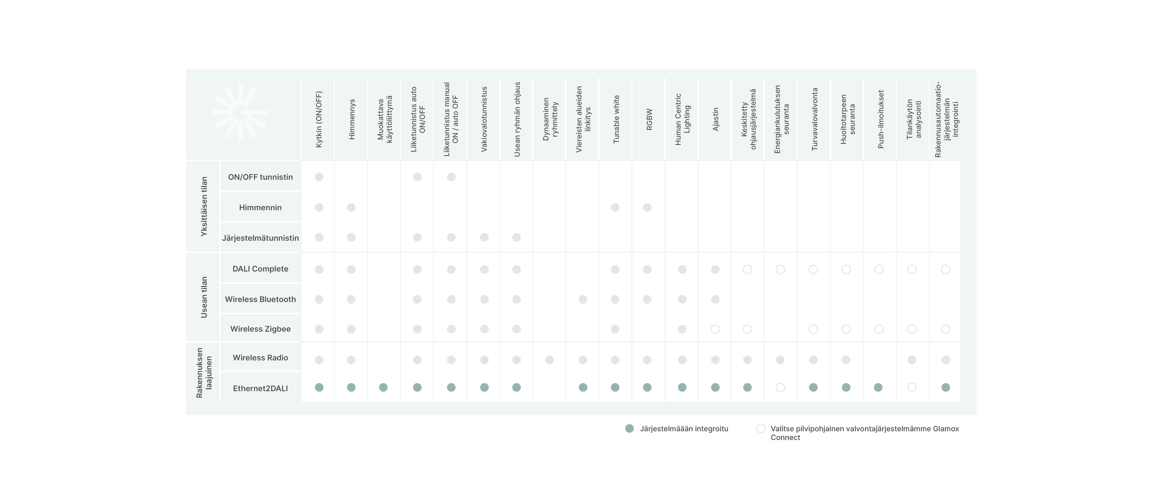 Järjestelmä sopii lähes kaikkiin kohteisiin laajan laitevalikoiman ansiosta, jolloin voidaan valita sopivat tuotteet erilaisiin ympäristöihin. Valikoimassamme on esimerkiksi DALI-2-valaisimia, tunnistimia, painikkeita ja turvavalaisimia, jotka voidaan kaikki yhdistää toimimaan samassa valonohjausjärjestelmässä. Järjestelmä voi olla minkä kokoinen tahansa, aina yksittäisestä tilasta useamman rakennuksen kattavaan saakka.