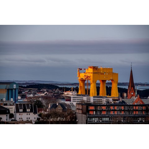 Photo: The DolWin epsilon platform towers over the dock at Aibel’s yard in Haugesund.