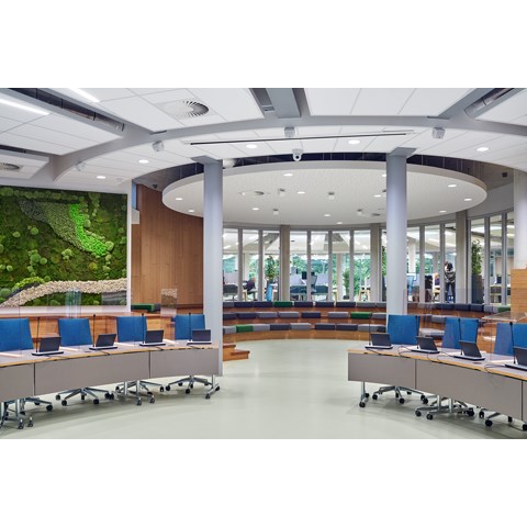 Een rond gebouw, met verschillende of geen plafonds en een wens voor lineaire armaturen bij de bureaufuncties, zorgt voor de nodige uitdagingen met betrekking tot gelijkmatigheid en Unified Glare Rating; een parameter met betrekking tot verblinding van licht. In samenwerking met installateur A&B Elektrotechniek en adviesbureau Galjema is het verlichtingsontwerp gemaakt. Een op maat gemaakt verlichtingsarmatuur en veel licht- en controleberekeningen zorgden voor dit mooie eindresultaat.