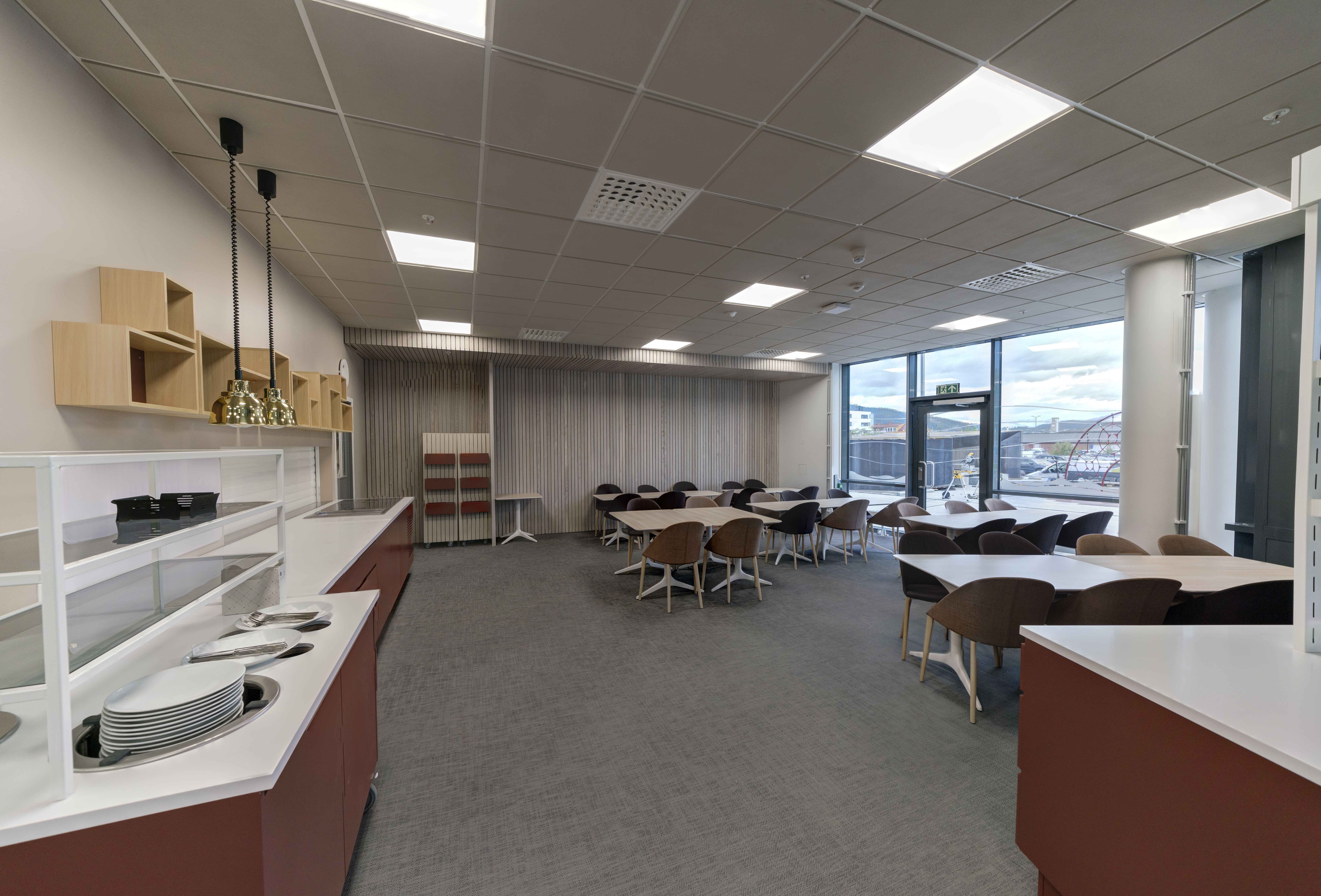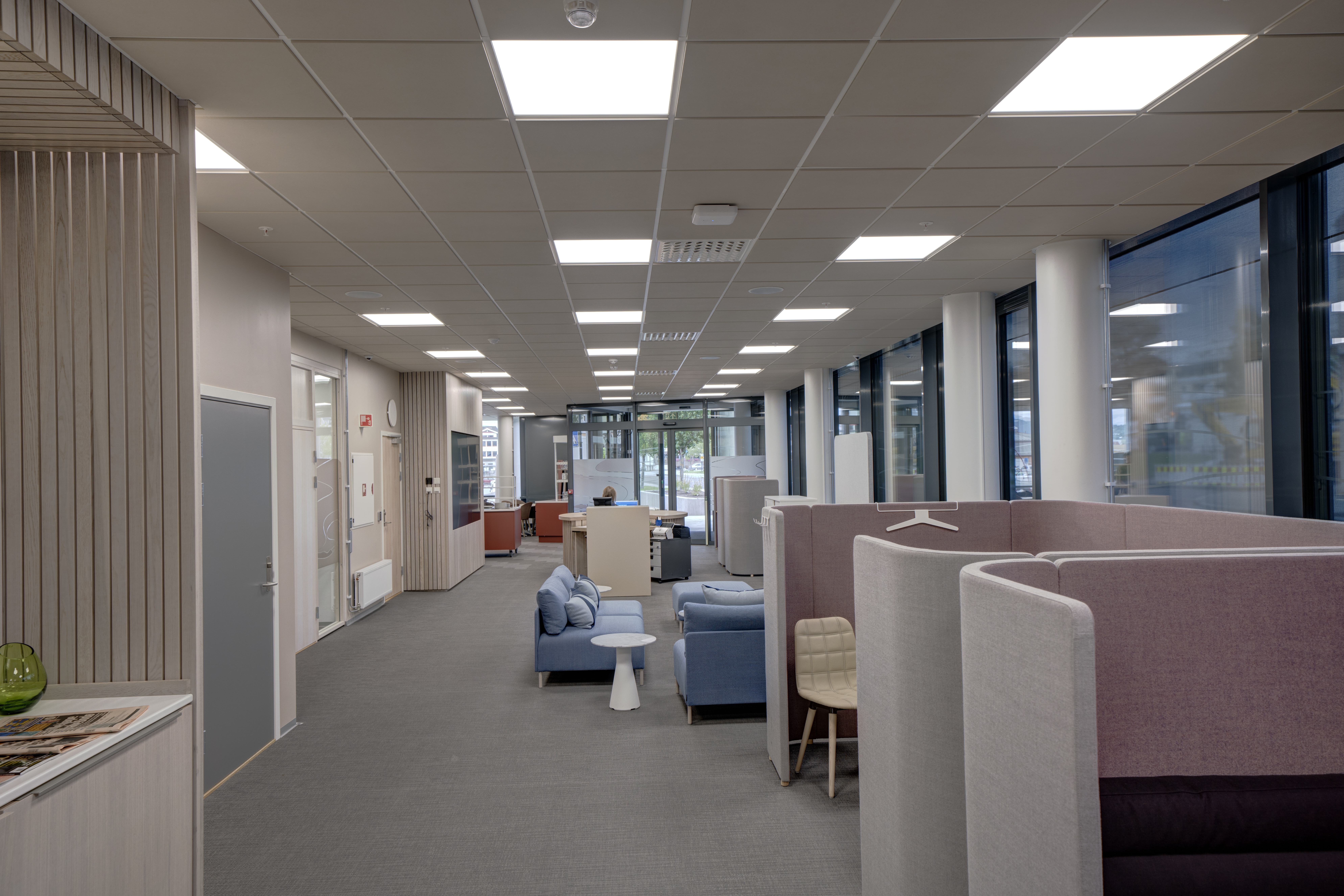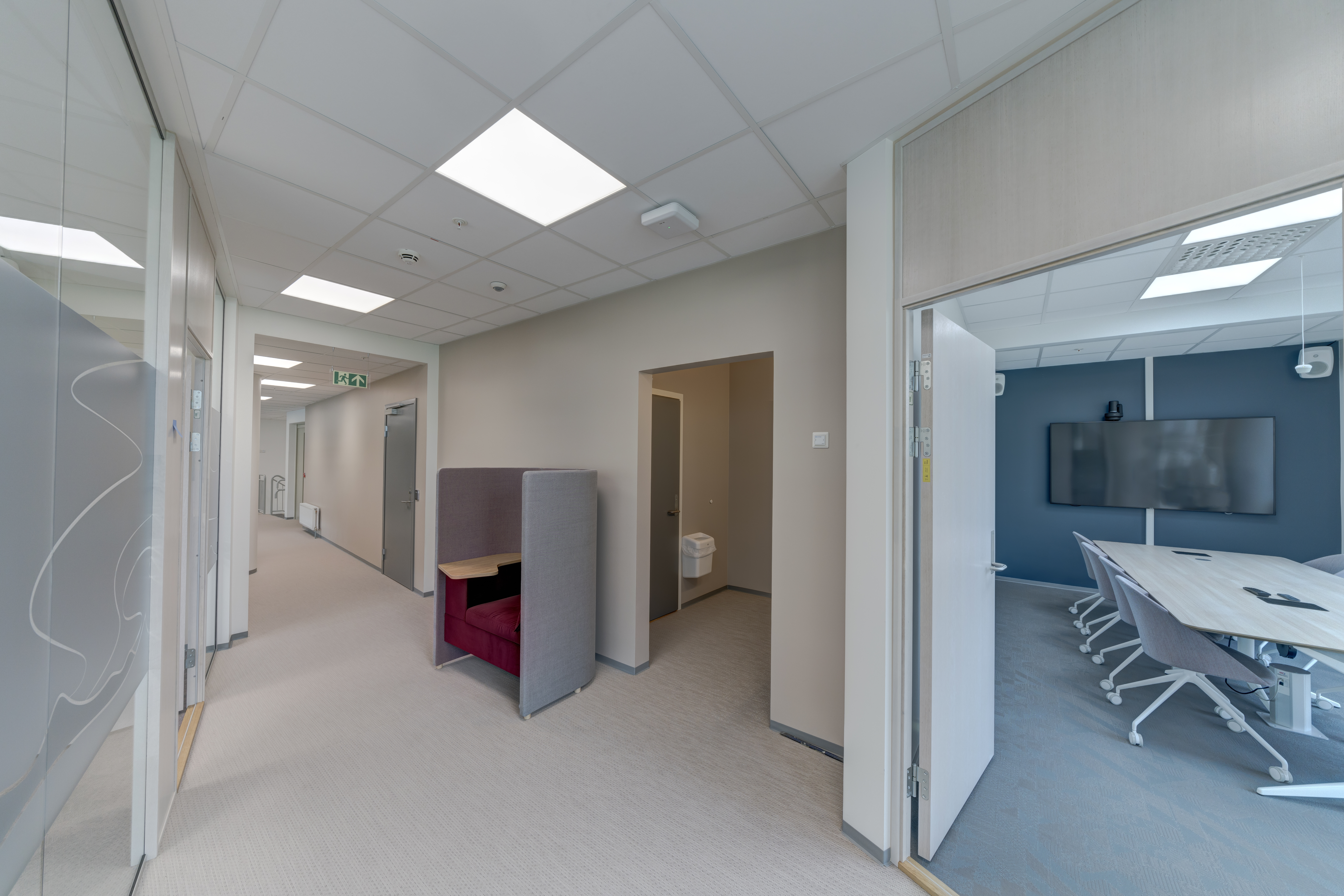 På møte- og stillerommene har man mulighet for å justere lyset i tre kategorier – normal belysning (4000 kelvin, 500-lux), rolig belysning (3000 kelvin, 500-lux) og fokusbelysning (6000) kelvin, 800 lux), etter ønske.