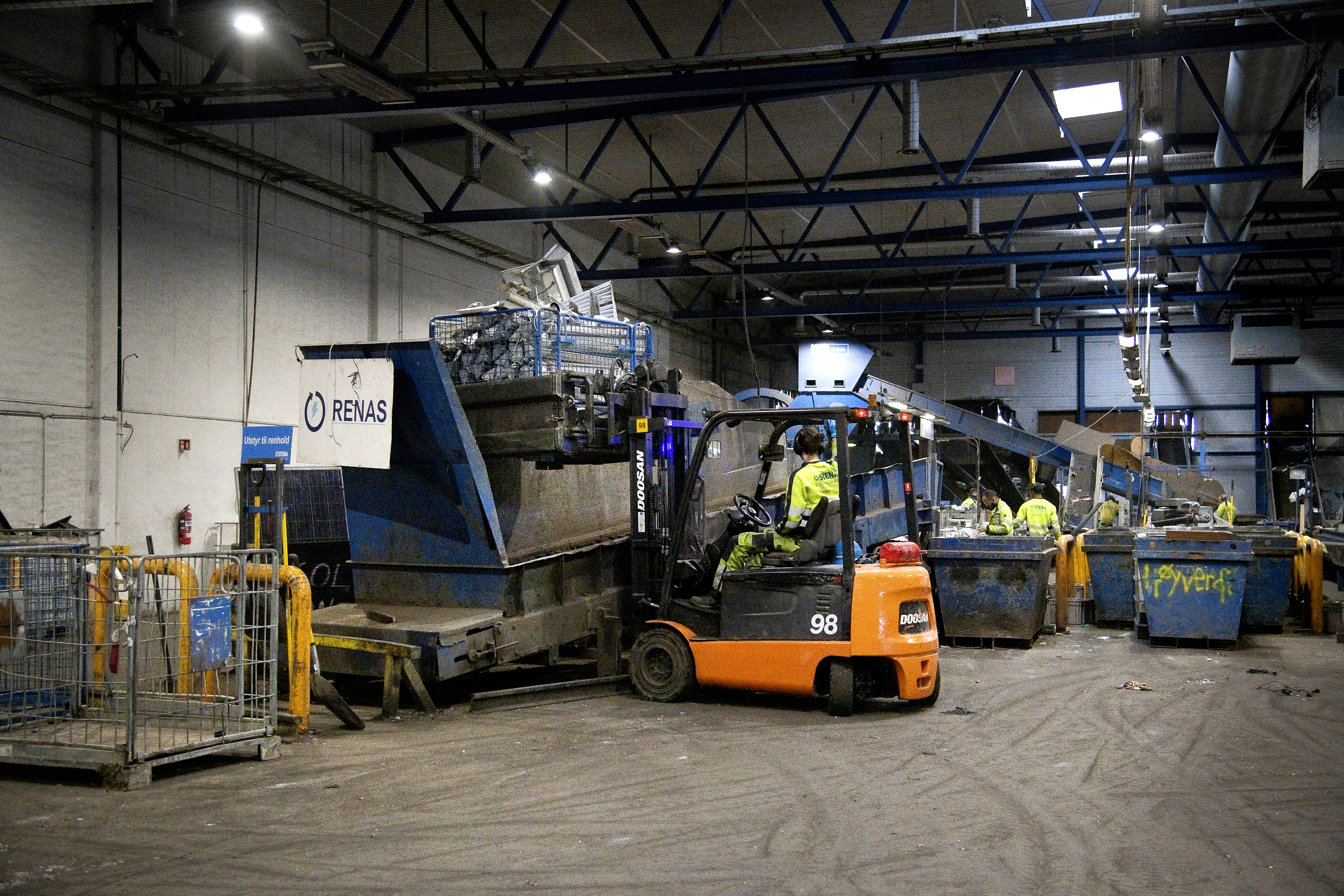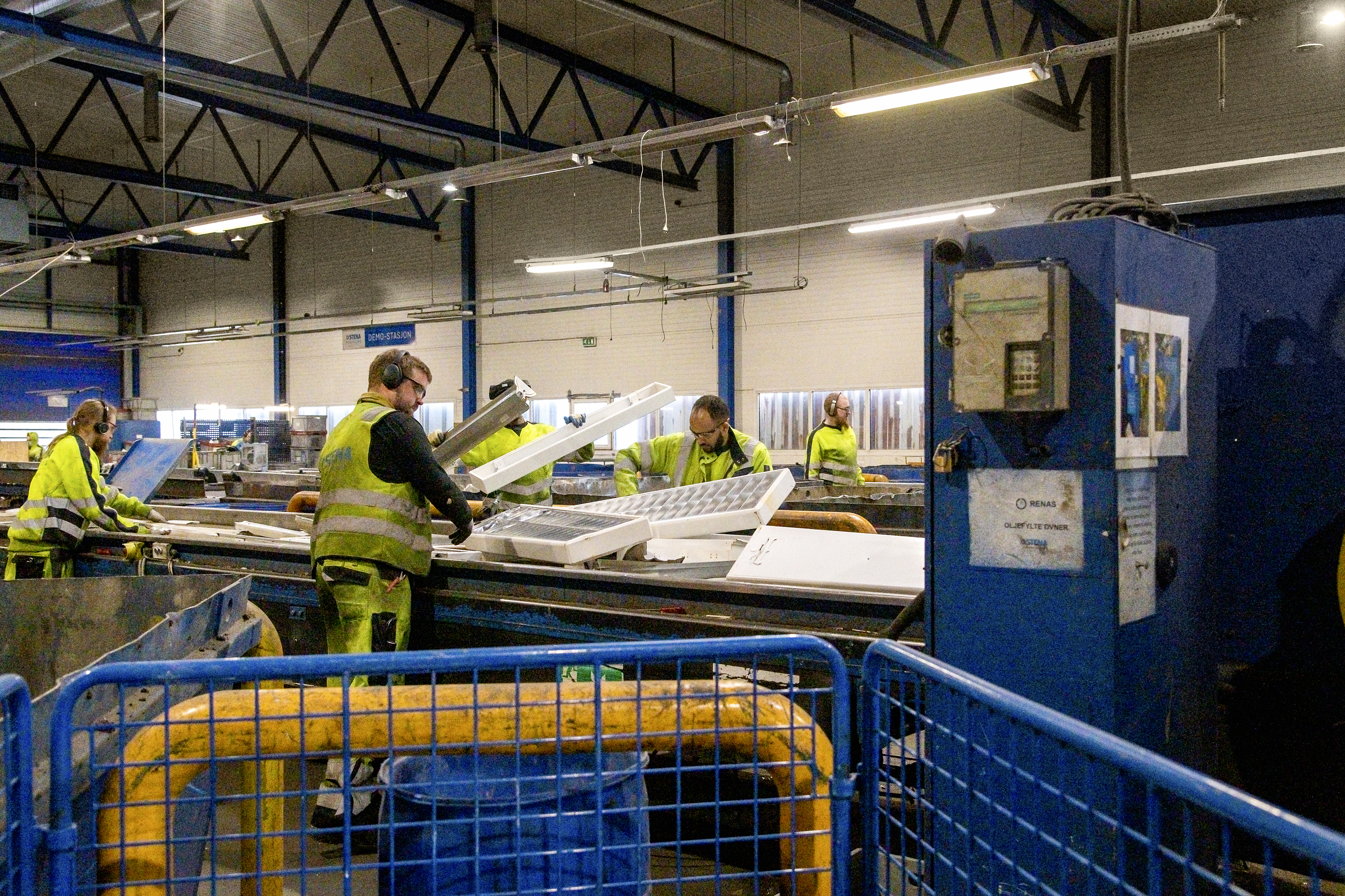 Under et besøk på deres anlegg på Romerike, fikk vi se store containere fylt med armaturer, for det meste fra Glamox, og hvordan de behandles før resirkulering. Ledningene klippes av og armaturen sjekkes for PCB (polyklorerte bifenyler), en gruppe giftige kjemikalier som ofte finnes i eldre elektroniske produkter. Armaturen brytes deretter ned i mindre biter for å skille de forskjellige metallene som brukes – ofte jern eller stål, kobber og aluminium – samt plast.