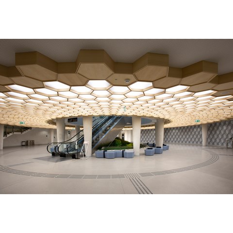 Na bazie systemów 6000 stworzyliśmy stojące oprawy w kształcie charakterystycznej kierownicy – logo PKS. Przy drzwiach wejściowych zamontowaliśmy oprawy typu FLOW z kolorowymi korpusami o różnych średnicach, natomiast zmodyfikowany system PLAFON bez dyfuzora nawiązał kształtem do szklanych świetlików na kopule spodka. Kolejny produkt custom-made – oprawę HALO w wersji DALI – zastosowaliśmy też do oświetlenia peronów autobusowych. Ponadto prawie 80% wszystkich opraw zintegrowaliśmy z systemami sterowania. W ten sposób zoptymalizowaliśmy wykorzystanie oświetlenia, co bezpośrednio przekłada się na ogromne oszczędności energii elektrycznej i mniejszą emisję CO2.