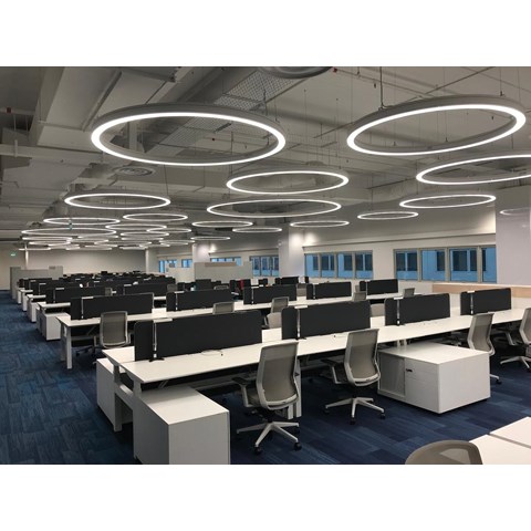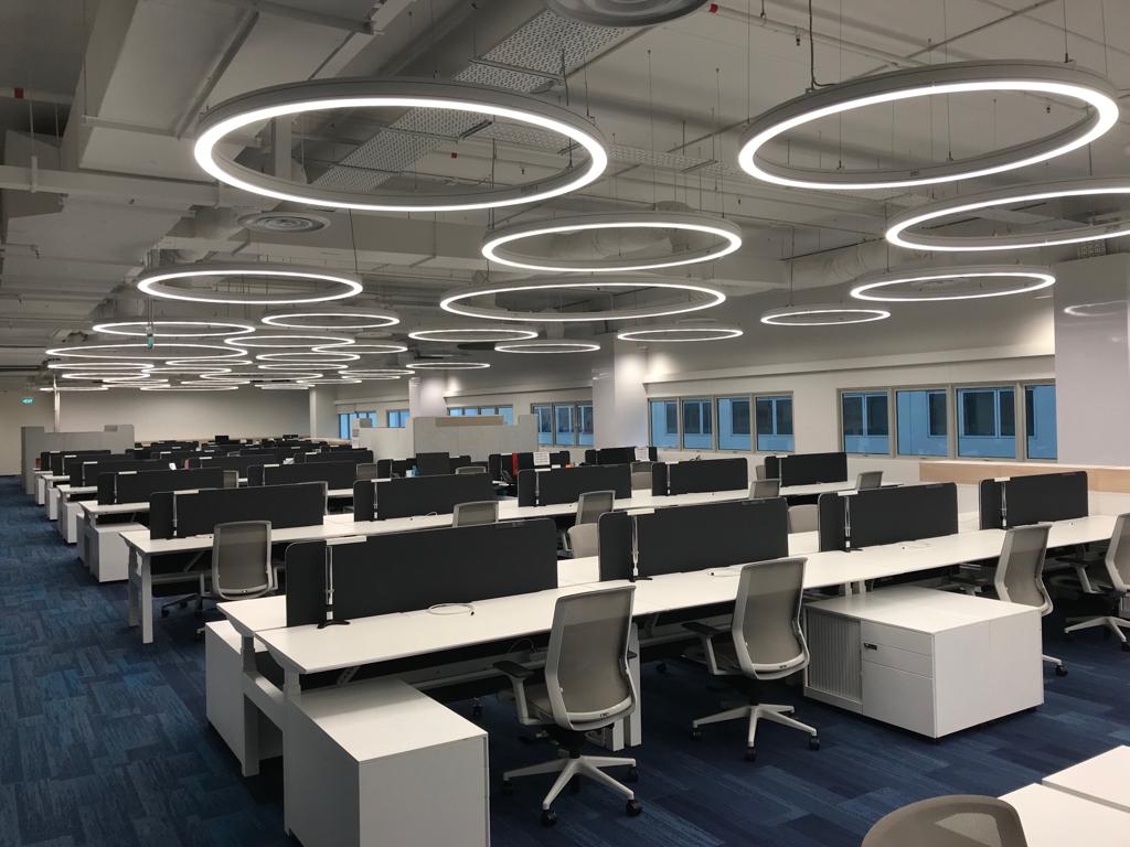 Nowa siedziba wymagała oświetlenia o nowoczesnym wzornictwie jednocześnie stwarzającego odpowiednie warunki do pracy. W tym celu w salach konferencyjnych, open space’ach i strefach relaksu zainstalowaliśmy oprawy oświetleniowe 6000 FLOW oraz 4000 LED, które cechują oryginalne formy i równomierne rozświetlenie. Dodatkowe źródło światła stanowiły oprawy typu downlight CANOS, które zapewniły odpowiedni poziom natężenia oświetlenia.