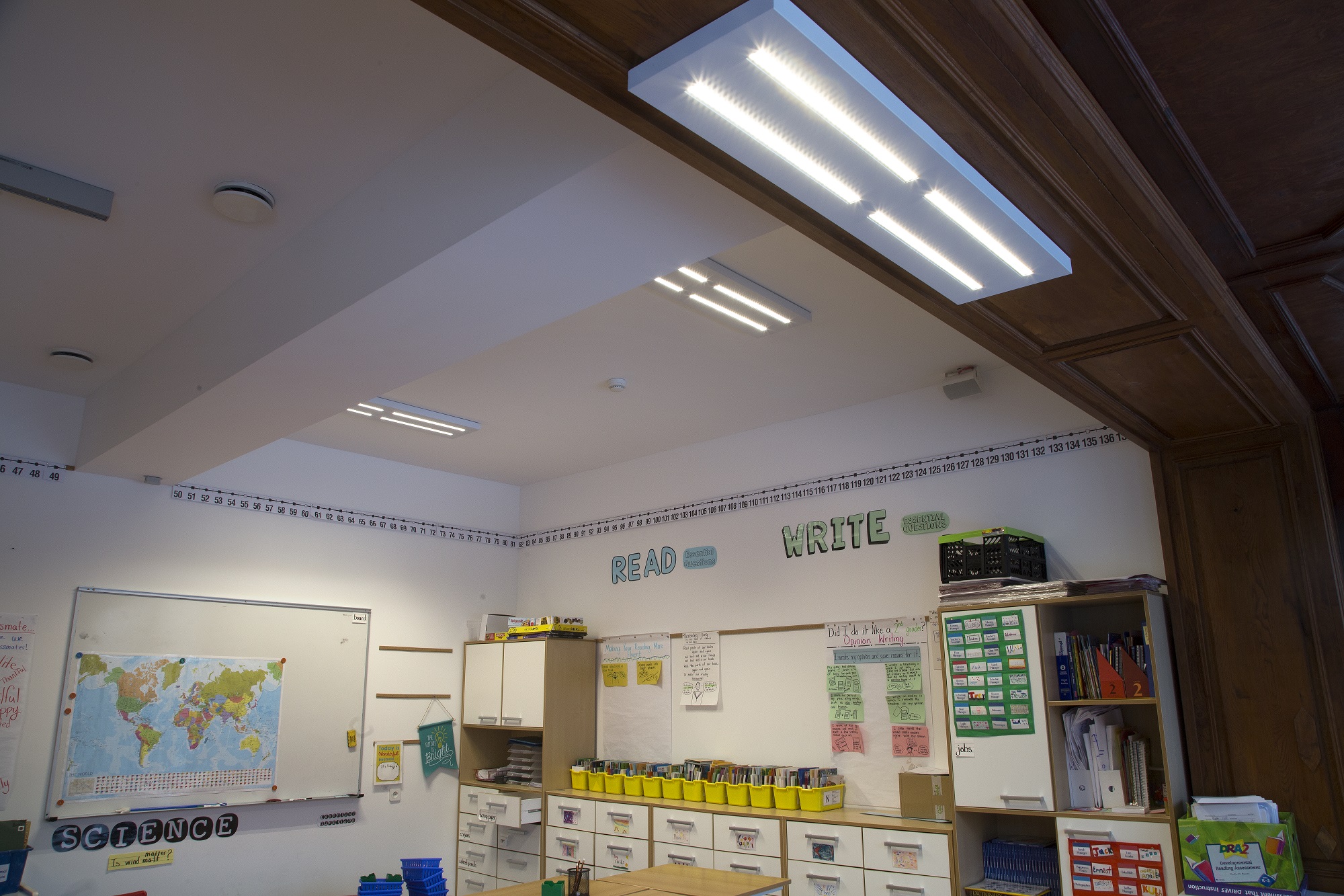 W salach zastosowano nowoczesne oprawy z rodziny Moderna, które zapewniają wyjątkową równomierność światła i nie powodują negatywnego efektu olśnienia, dzięki czemu dzieci mogą uczyć się w komfortowych warunkach. Cała szkoła wyposażona została również w wydajne oprawy liniowe i nowoczesne oświetlenie typu downlight. Niezawodne oświetlenie awaryjne zapewnia odpowiednie bezpieczeństwo.