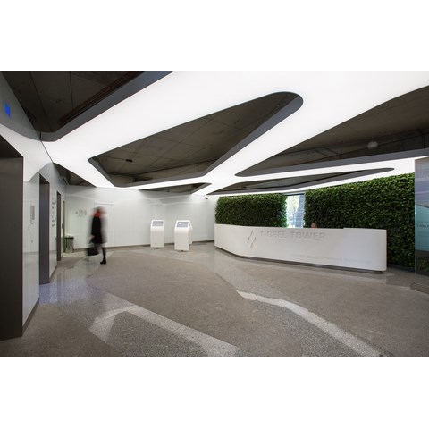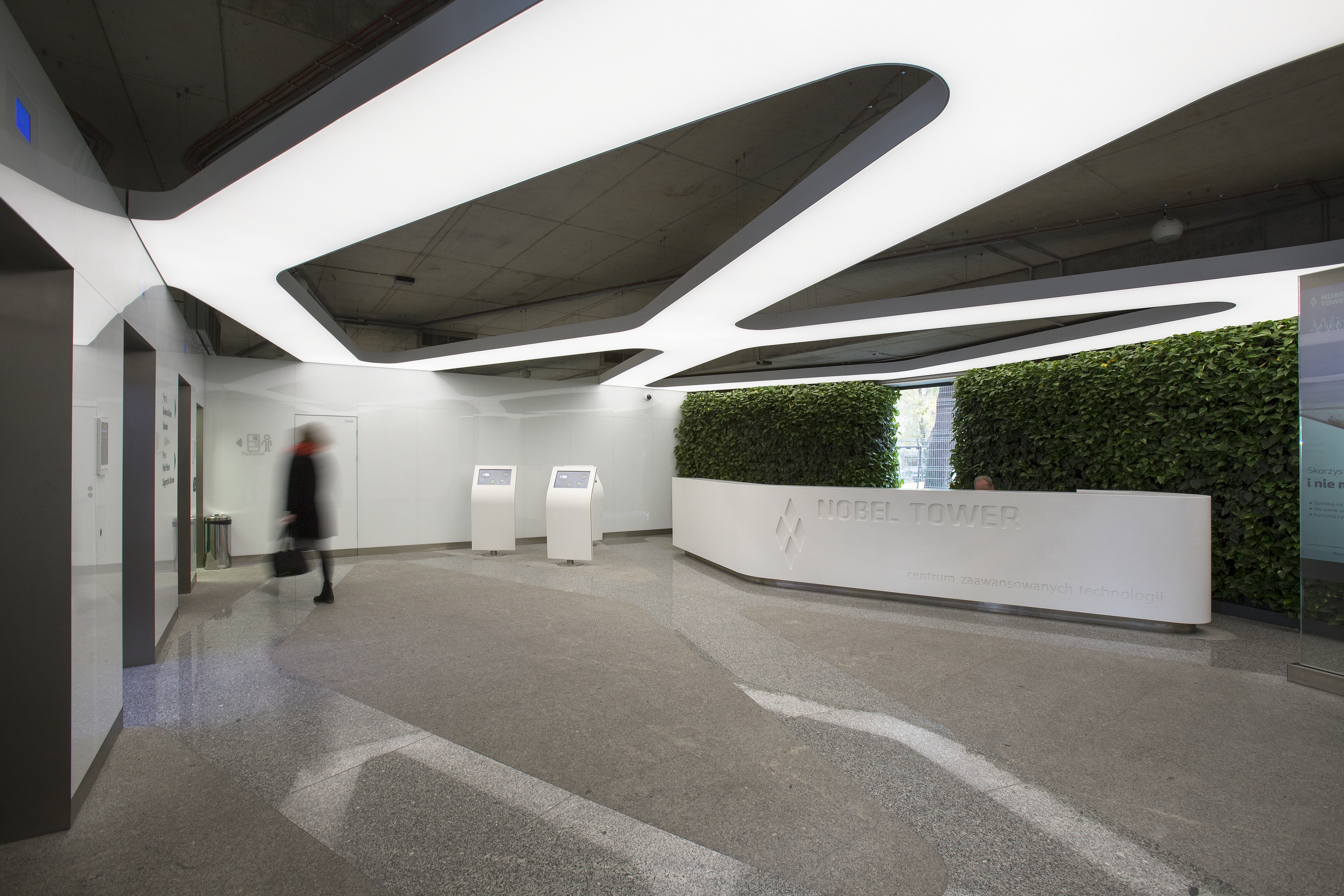 Tak nowoczesna organizacja musi mieć odpowiednią przestrzeń dla swojej aktywności. Budynek Nobel Tower jest wyjątkowy. Fasada utrzymana w chłodnych odcieniach bieli i stali opleciona jest delikatną, amorficzną tkanką. Ten sam motyw został wykorzystany wewnątrz budynku. Korytarze oświetlane są nieregularnymi oprawami, nawiązującymi kształtem do fasady budynku. Taki efekt był możliwy dzięki zastosowaniu systemu LUNA IRREGULAR. Dyfuzor w postaci rozpraszającej błony termonapinalnej pozwala nadać oprawom dowolnym kształt. Dzięki pełnej personalizacji wszystkie parametry systemu, takie jak temperatura barwowa, moc czy strumień świetlny zostały dostosowane do wymagań realizacji.y