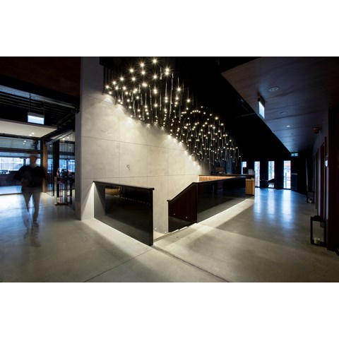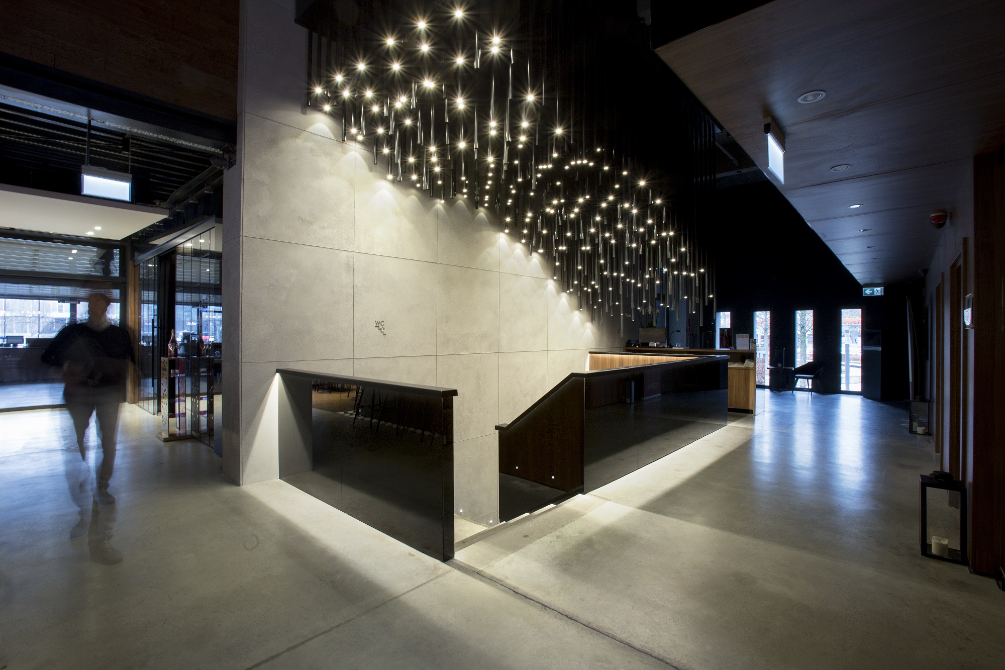 Niepowtarzalny efekt w industrialnych wnętrzach osiągnięto dzięki odważnym zestawieniom różnych materiałów, od szkła i stali po kamień i drewno. Za nowy charakter zrewitalizowanej zabytkowej hali drukarni odpowiadają również nasze liczne systemy oświetleniowe, w tym oprawy CAMELEON, COSMO LED i LUNA LED. Jednak na szczególną uwagę zasługują zaprojektowane właśnie dla tej inwestycji przyciągające wzrok oprawy STIXX, które nadają miejscu nowoczesnej ekstrawagancji.