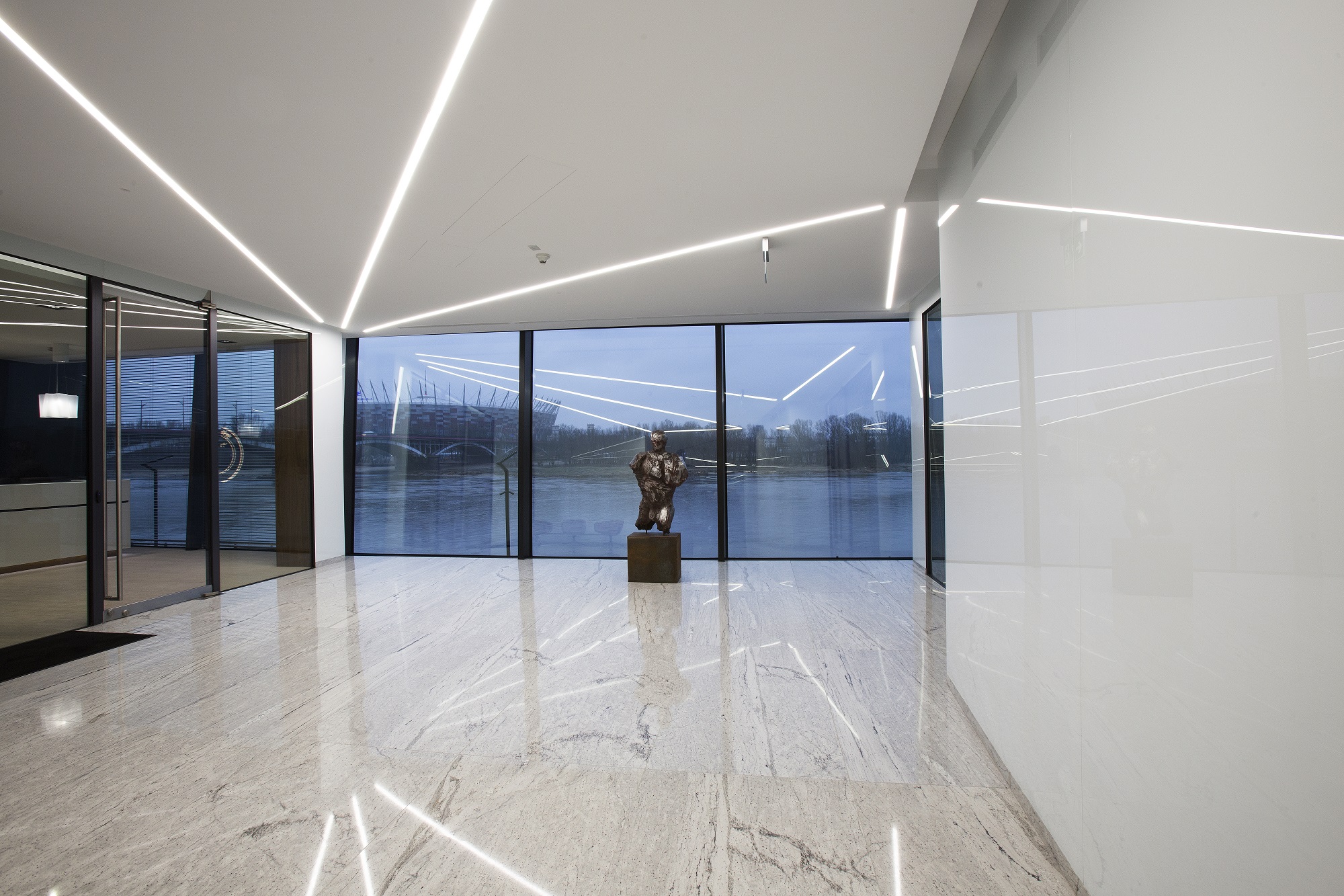 Unikalną formę biurowca dopełnia równie zjawiskowa aranżacja świetlna wykorzystująca między innymi nasze oprawy oświetleniowe 4000 BIS LED. Zlokalizowany nad samym brzegiem Wisły budynek mieści luksusowe apartamenty i ponad 13 tysięcy metrów kwadratowych powierzchni biurowej.