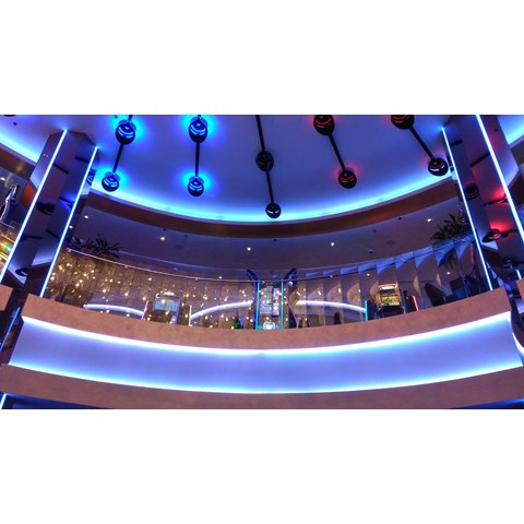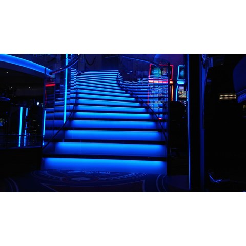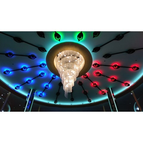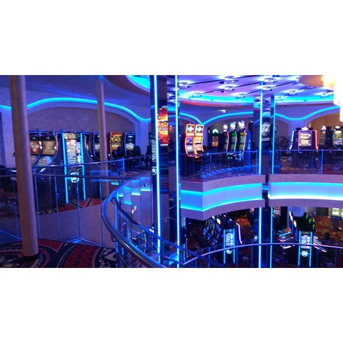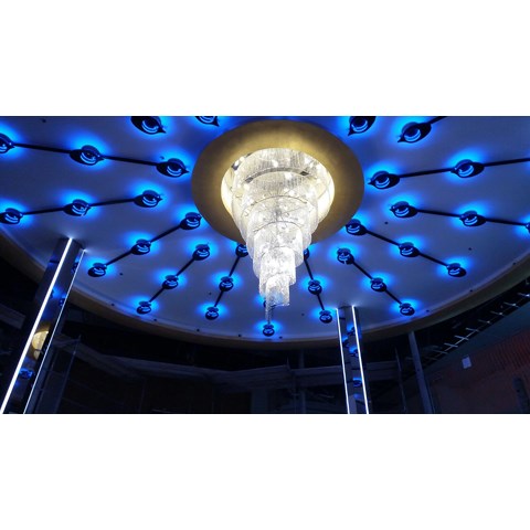 Dolne piętro przeznaczono na strefę barową, mogącą obsłużyć setki gości oraz ekskluzywną część wyłącznie dla VIP-ów. Efektowne spiralne schody, nad którymi góruje imponujący żyrandol połączyły obie te części kasyna, nadając wnętrzu wyjątkowego charakteru. Inwestycja ta obejmowała zarówno powstanie kasyna, jak i hotelu. Oświetliliśmy wszystkie te wnętrza zgodnie z wysokimi oczekiwaniami inwestora.